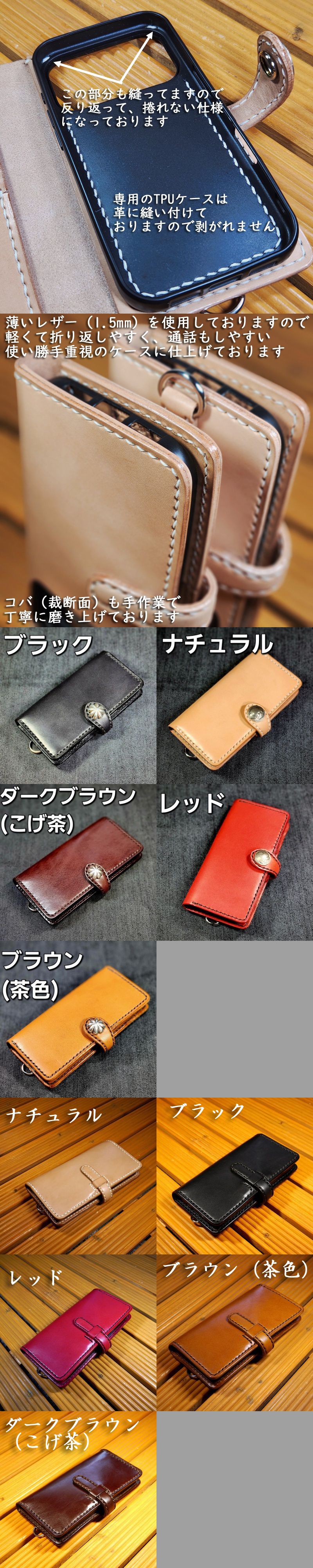 商品の製作に15日~30日程お時間を頂きますので、予めご了承下さい馬具職人工房では、厚いレザー(3.5mm厚)を使用した極厚スマホケースの販売も行っておりますが、こちらの薄型スマホケースは、ベースの革は、薄い革(1.5mm)を使用しております