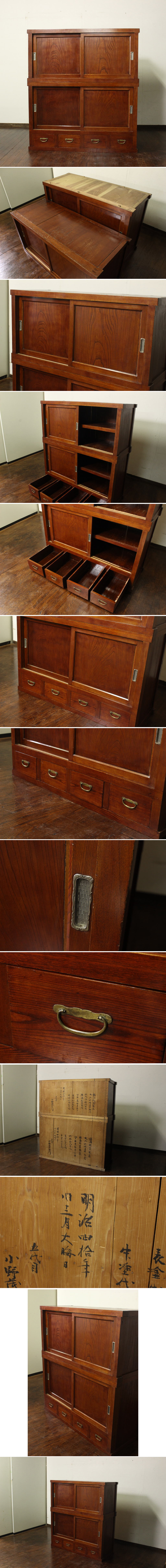 商品紹介 | 古い水屋箪笥です。 時代の雰囲気・味わい十分でとてもかっこいいです。 背面に明治時代の墨書きがあります。 引戸鏡板や前枠などには杢模様よい欅材が使われています。 重ねタイプのシンプルデザイン。 アンティーク・レトロ系の食器棚や飾り棚、収納にオススメです。 |
