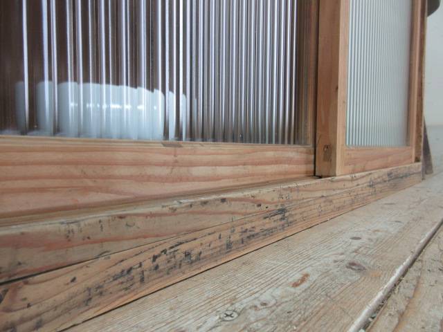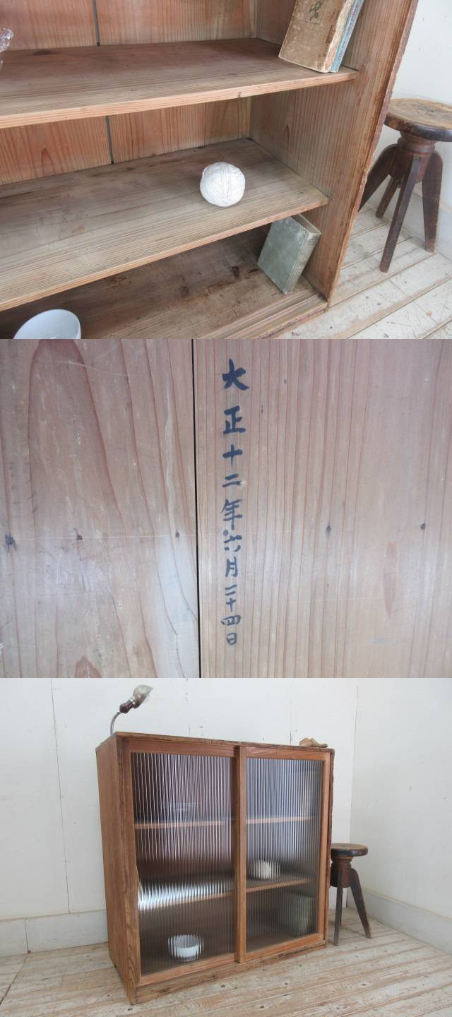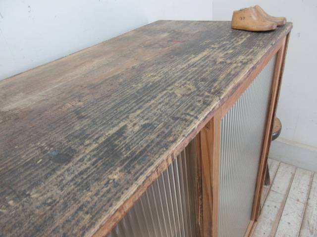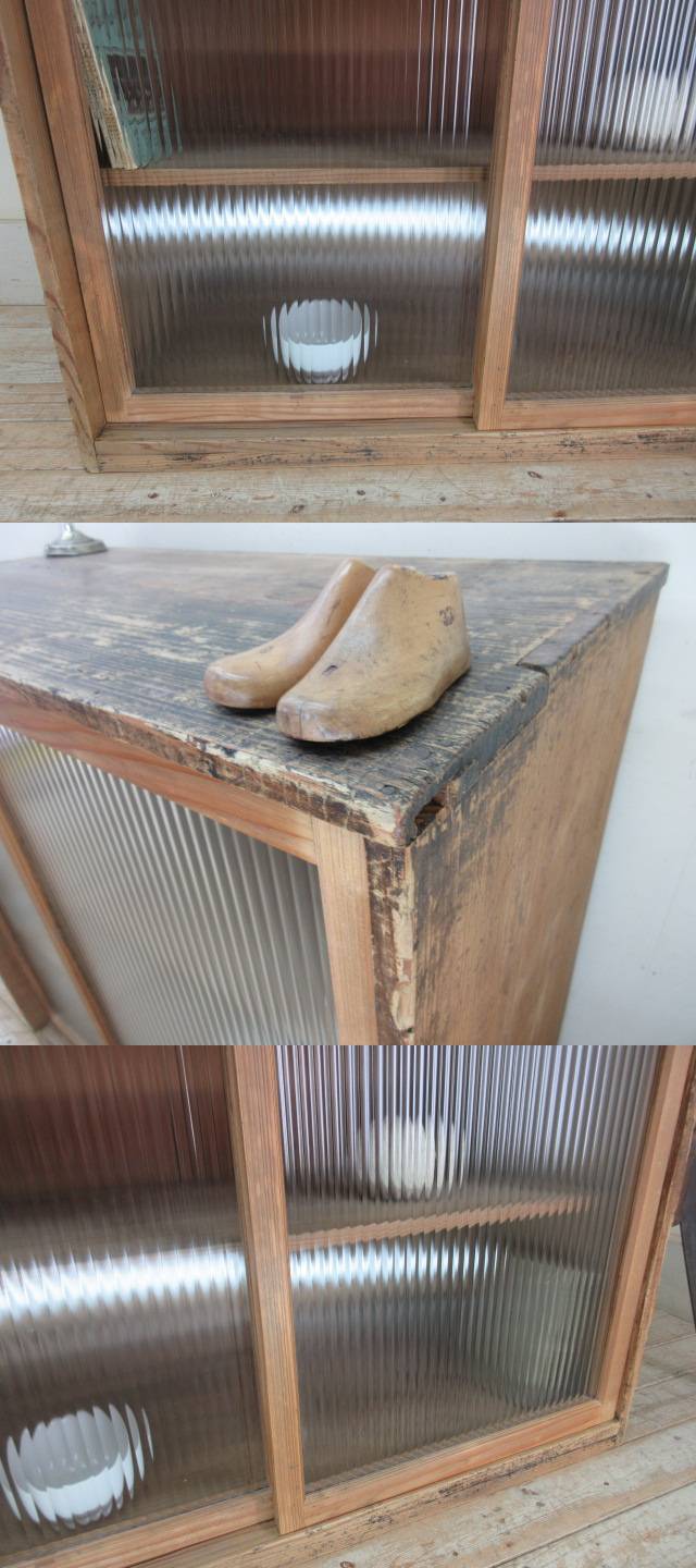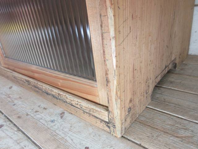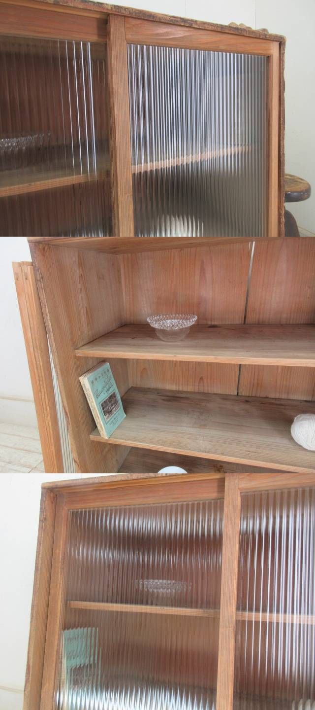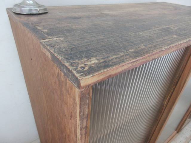 古い木味モールガラスの収納棚G124 アンティーク家具陳列棚食器棚水屋箪笥店舗什器カフェ什器無垢材古家具 收藏
