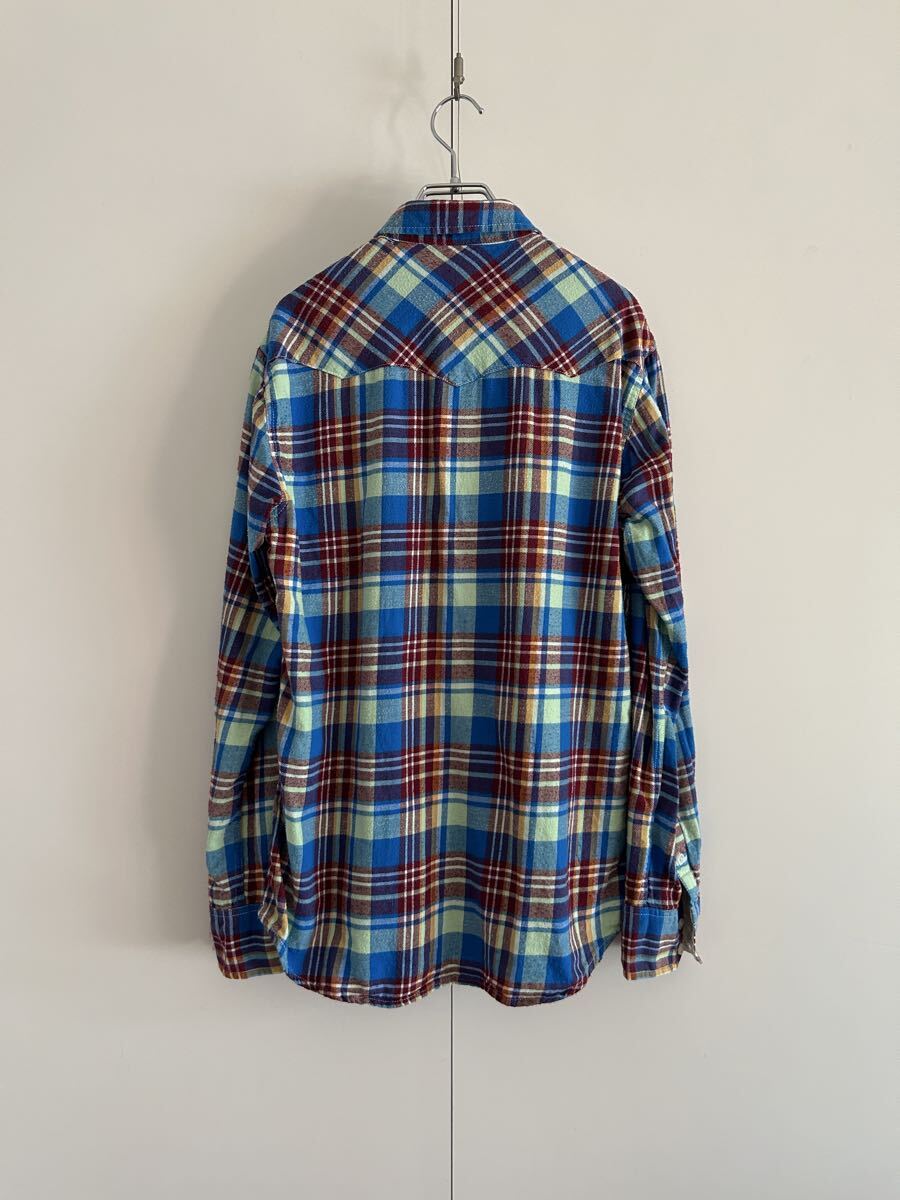 存在感抜群のラングラー、ウエスタンフレーバーを効かせたフランネルシャツです。マルチカラーのチェックが軽快で、羽織るだけでラギッドなムードを演出してくれます。古着らしい風合いと相性抜群のクラシックな一着。街でもアウトドアでも使い勝手の良い万能シャツです。