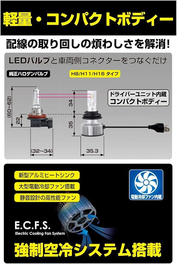n_IPF ヘッドライト フォグランプ JL62 LED 車用 H8/H11/H16 4400lm 6200K ホワイト 12V24V兼用 2本入 新車検対応 收藏