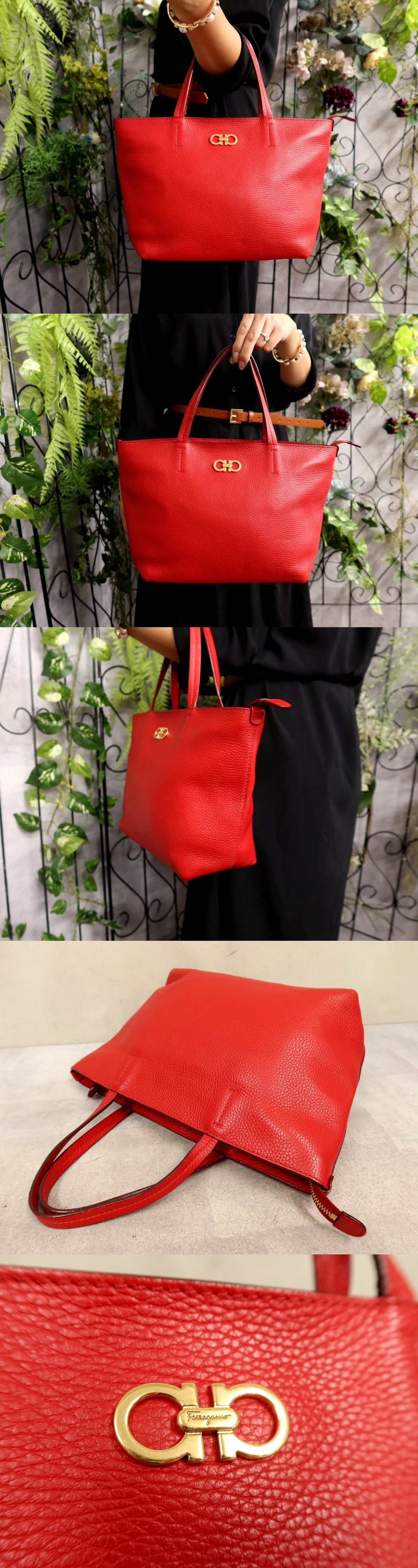 ●超美品●Salvatore Ferragamo フェラガモ●ダブルガンチーニ●カーフ レザー 本革●トート ハンド バッグ●赤●G金具●B5 収納●Js61429 收藏
