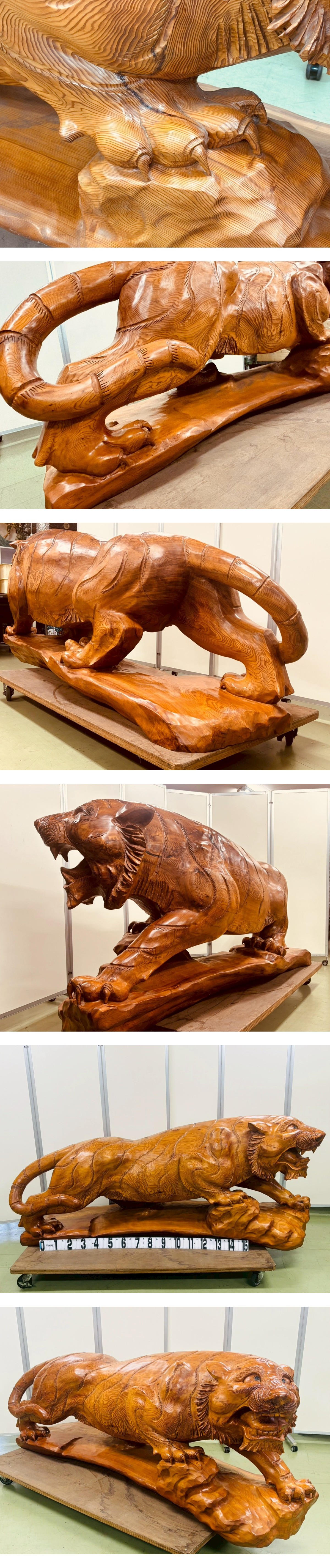【屋久杉 特大木彫虎】横230㎝ 彫刻 迫力満点 一刀彫 風水 開運 置物 芸術作品 骨董 飾物 伝統工芸品 一点物 百獣王 直接現地引取限定 收藏