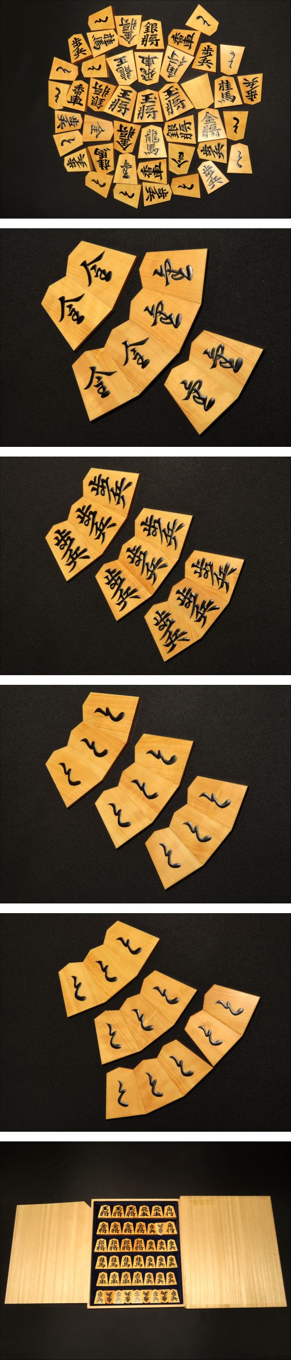 木地は御蔵島黄楊、赤柾とまでは行きませんが上柾目の味の良い木地です。赤柾まであと一歩、という意味で「赤系上柾目」と謳わせていただきました(木地が「赤い」という意味ではありません)。全ての駒の表裏をUPいたしましたので是非ご覧ください(木地種表記は私見です、写真でご確認をお願い致します)。