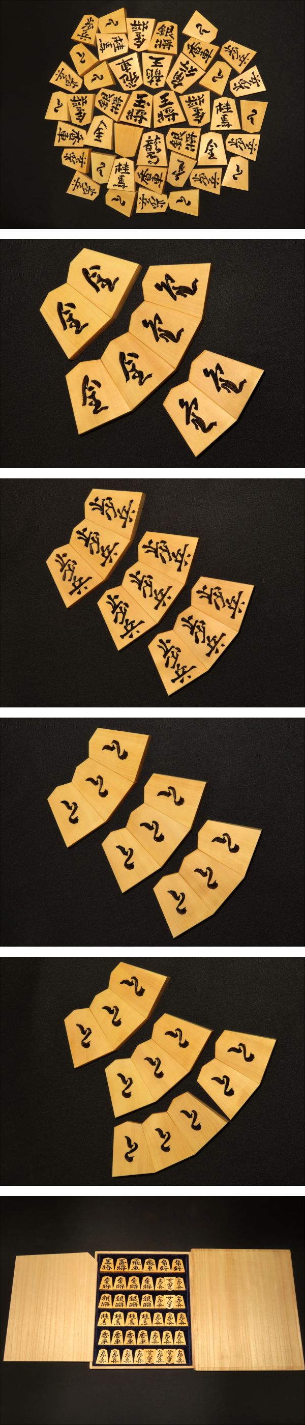 木地は御蔵島黄楊斑入柾目。ご覧のとおり非常に味の良い木地です。全ての駒の表裏をUP致しましたので是非ご覧下さいませ。