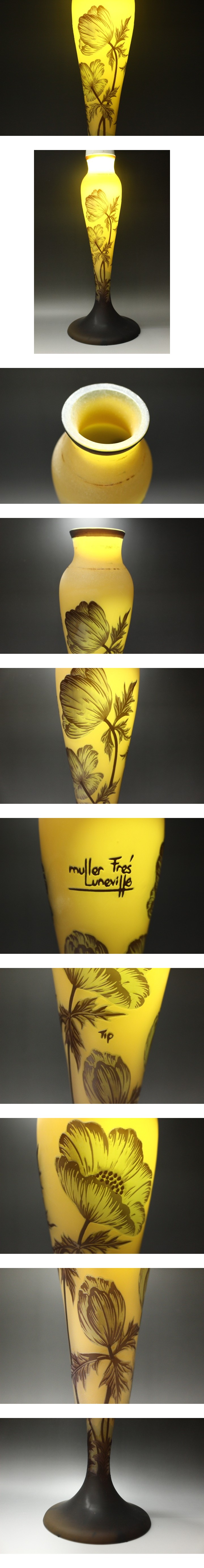 f536 技巧名品 Muller Freres Luneville ミューラー兄弟 ランプーベース 花瓶 草花文 彫刻 高40.0cm アールヌーヴォー カメオ彫技法 收藏
