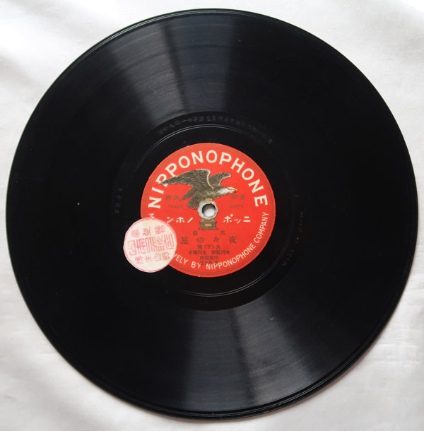 「SP盤『三曲 夜々の星(上)(下)/米川親敏、米川輝子、中尾都山』」です。盤の状態は経年の小スレ、小傷等見られます。(上)の出だし部分に少し気になる傷と(下)の後半部分に小さな盛り上がりがありましたのでその部分は視聴させていただきましたが特に気になる程ではありませんでした。SP盤は以前にコレクターの方から出来れば視聴はしないでほしいと頼まれた事がありそれ以降は特に気になった部分以外は視聴しておりませんのでご了承お願いいたします。