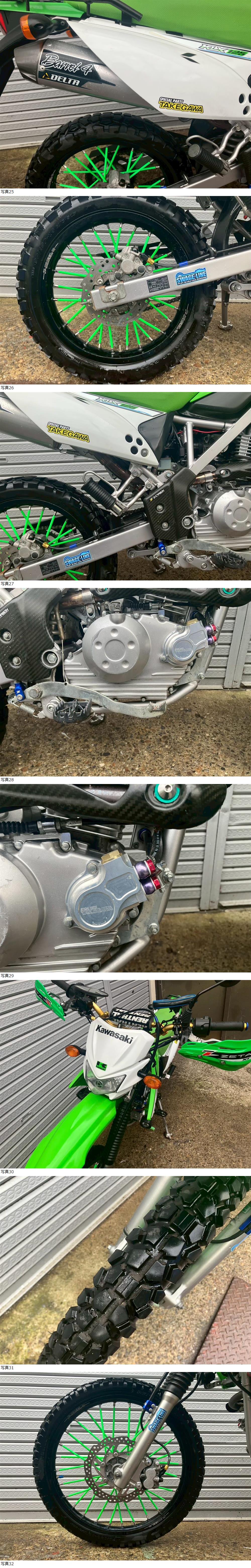 | 商品説明 | この度は当出品車両をご覧頂きまして誠に有難う御座います。 他にも複数台出品がございますので宜しければご覧ください! ご入札頂けた際には文末にありますお取引詳細にご同意頂けたものとさせて頂きます。 下記車両詳細・お取引詳細になりますので必ずご一読くださいませ! また、直接お越しいただいた方にその場で販売することもあるため予告なしに出品の取り消し等をする場合も御座います。 よって、落札前には一言コメント欄にてご一報頂けますと幸いです。予めご了承下さい。 〜〜車両詳細〜〜 メーカー:カワサキ 車種:KLX125 年式:2010年 色:緑 鍵:純正キー2本 排気量:125cc 走行距離:8,551km 燃料供給装置:インジェクション フレームNo:LX125C-A04XXX 自賠責:なし 自賠責の加入も可能です! * * * 低走行でオプション多数なKLX125入荷いたしました☆ ・外観 多少の小傷などあるものの目立つ傷割れはなく非常に好印象な1台です! 詳細は写真にてご確認ください。 オプションとしてZETA製バーエンド、レバー、ナックルガード TAKEGAWAオイルクーラー、デルタ製マフラー、社外シート、USB、スマホホルダ 社外ハンドル、ハンドルポストなど御座います。 ・エンジンセルにて始動O K! 吹け上がり良好! 確認箇所は以下となります。 スピードメーター:作動OK! ヘッドライト:ハイロー点灯! ウィンカー:前後左右点灯! テール:尾灯・ブレーキ共に点灯! ナンバー灯:点灯! ホーン:作動OK! ★別途部品交換受け付けます! ・タイヤ前後交換など!詳細は直接お問い合わせくださいませ! エンジンオイル・タイヤ交換など! 詳細は直接お問い合わせくださいませ! *上記ご利用の際は部品の在庫状況によりお引き渡しまでにお時間を頂戴する場合が御座います。 〜〜お取引詳細〜〜 ※ご注意ください※ 出品車両はあくまで現状販売となります。走行点検などは行っておりません。 良好・好印象などの表記に関しても車両の状態を確実に保証するものではなく 細かい程度の差なども含めあくまで当方の主観でありますこと重々ご承知置き下さい。 特別に気になる箇所など(外観に限ります)がある場合は直接ご相談ください。 ご指定いただきました箇所のお写真を添付をさせていただきます。 (あまりにも多い場合はご対応致しかねます。) 上記を踏まえまして現車の確認は大歓迎です。 細かい箇所など気になる方は是非とも現車確認を行ってください! (予約制となりますので直接お問い合わせください。) 一般の二輪販売店と同様の点検・整備は行っておりません。 車両に関する一切の保証等も御座いませんので自走でのお引き取りはお断り致します。 ある程度の知識があり落札後にご自身で整備の出来る方、或いは整備工場等にて分解整備を別途検討できる方、メンテナンスベースとしての使用などの落札を推奨しております。 明記してあること以外の確認はしておらず、また致しかねます。 目視できる消耗品以外のパーツに関しましても寿命のわからぬものなど御座います。 (中古品ですのでつい先程まで正常に作動していたにも関わらずお受け取りの際に状態の変化などある場合も十分御座います。例・電子機器、ワイヤー類など) 再三にはなりますが如何なる場合もお引き渡し後のキャンセル・クレームはお受け致しかねます。 現状販売というものを重々ご理解の上ノークレーム・ノーリターンでよろしくお願い致します。 原則キャンセルはお受け致しかねますが、止むを得ず落札者様都合でキャンセルされる場合には 落札金額の1割をキャンセル費用として頂戴させて頂きます。 上記取引内容に不安を感じられる方には二輪販売店等の整備・保証付き車両のご購入を強くお勧め致します。 ★直接引き取り・即引き取り大歓迎! 直接引き取りの場合、落札から1週間以内にお引き取り下さい。 それ以降日割りにて2,200円を別途頂戴させて頂きます。 *部品交換をご依頼の方は完成のご連絡から1週間以内となります。 ★配送OK! 主に配送業者に委託しております。ご自身で手配いただいても結構です。 レッドラインの金額を参考にしておりますのでお手数ですが費用に関しましては落札者様にて直接HPでご確認下さい。 発送元は埼玉県川口市となります。ご購入から配送までの目安は関東近郊で1〜2週間程度となるかと思います。(地域、期間により大幅に異なりますので納期が気になる方は直接レッドラインへお問い合わせ下さい。) 関東近郊の場合割増でお早めにお届けできる場合も御座いますので一度ご相談下さいませ!(対象外となる場合も御座います。) また、配送の場合もお取置き等の対応は致しかねますので落札後は速やかに配送依頼の手続きを行わせて頂きます。 ★車両のみの販売となりますので必要な場合のみ別途5,500円にて販売証明書の発行・発送を受け賜ります! ★新規アカウントの方、落札者様の評価内容によりましては、ご入札頂いても当方の判断で削除する場合がございます。予めご了承下さい。 ★落札後、24時間以内にお客