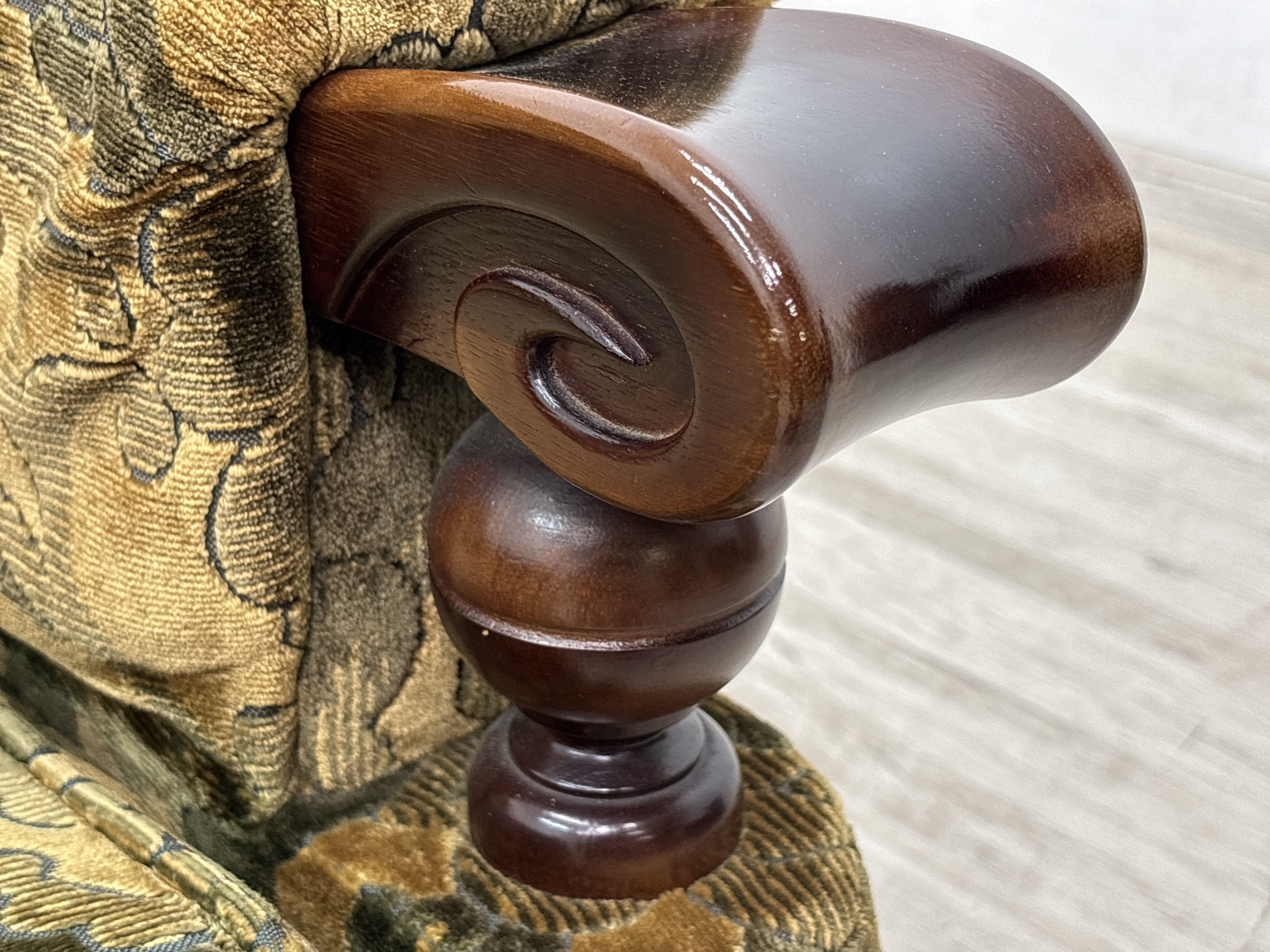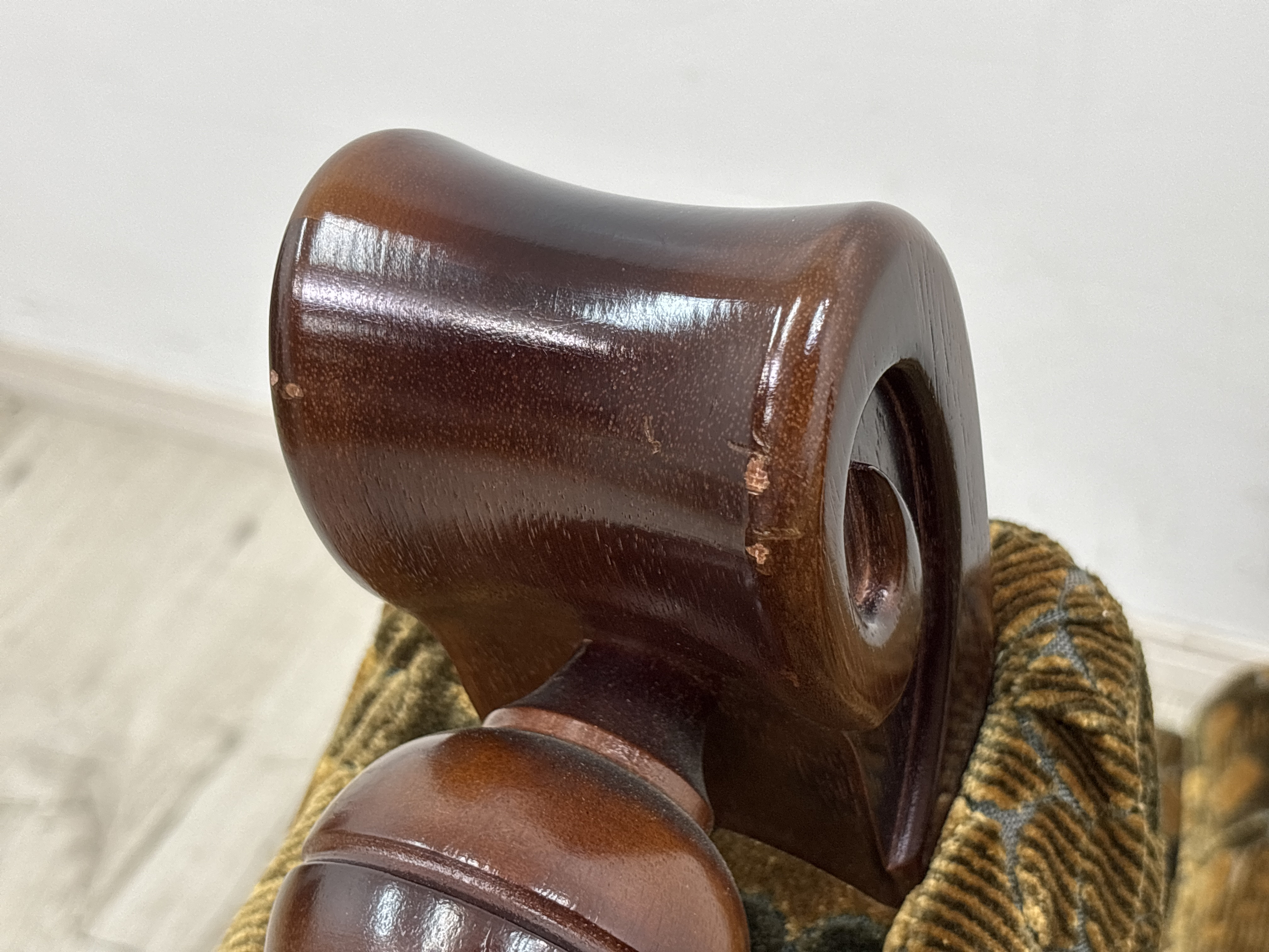 こちらは 金華山模様のクラシックなアーム付き1Pソファ です。 中古品です。 【カリモクについて】 カリモク家具は1940年に愛知県刈谷市で創業した国内製造家具メーカーです。 「100歳の木を使うなら、その年輪にふさわしい家具を作りたい」との思いで、家具づくりを行っています。 日本で最もスタンダードな家具メーカーのひとつです。 その中で特にカタカナで【カリモク】と表記されたお品は、1960~1980年代にかけて、昭和の日本の家庭で愛され、 現在では通称「オールドカリモク」と呼ばれる、家具愛好家やカリモクファンから絶大な人気を誇るお品物たちです。 近年では、当時の家具を再現したカプセルトイやミニチュアなども発売され、今もなお愛され親しまれています。 今回はそんなオールドカリモクの、1Pソファが入荷しましたので出品致します。 特徴としましては、幅広い長椅子タイプのソファで、ロングセラーモデルとなっており、 布地の金華山織りは、華やかかつゴージャスさを醸しており、男前な雰囲気を演出しています。 アームやモタレの作りは、ゆったり深く腰掛けられ、ソファとしてしっかりとくつろげる設計です。 また、脚部やアームに施された若干の湾曲は、どこか愛くるしさを醸し出しています。 また、再良市場では2025/11/25現在、同デザインのソファを同時出品中であり、 そちらと合わせることで、統一感のある立派な応接セットが出来上がります。 詳しくは下記リンクよりご覧ください。 【コンディションについて】 コンディションにつきましては以下の画像も併せてご覧ください。 【裏地 一部のタッカー外れ】 【両アーム 若干の小キズ・スレ】 おそらく前オーナー様が飼われていた猫と思われる、動物毛の付着を確認しております。 こちらにつきましては、全体及び隙間等を掃除機、粘着テープなどで清掃し、可能な限り除去致しました。 動物のニオイ残りについては4,5箇所確認いたしましたが、動物臭は感じられないように思えました。 その他、使用感に伴い、細かな小キズなどはありますが、 クッション性については真ん中が腰かけるとわずかに沈むものの、 左右には大きなヘタリもありませんでした。 使用を損なうレベルの割れ、キズなどはなく、1Pソファとして問題ありません。 まだまだ長きにわたってお使いいただけるお品です。 新品では巡りあえない、ユーズドならではのエイジングが美しいインテリアです。 クラシックな家具がお好きな方におすすめとなっています。 是非この機会にご検討ください。 皆様のご入札をお待ちしております! 同シリーズのソファを同時出品中です!(2025/11/25現在)
