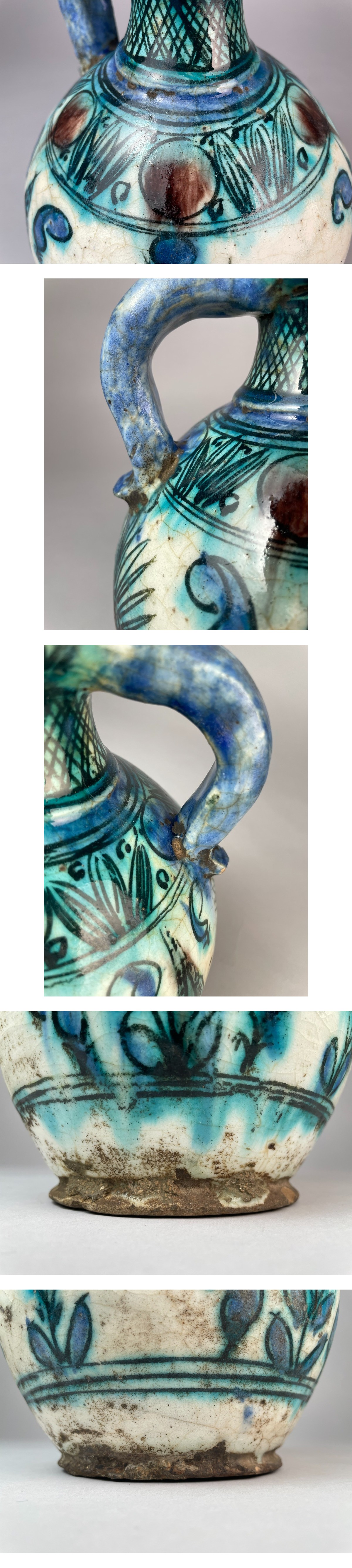 A758 ペルシャ イスラム陶器 青緑釉 水差し ジャグ 花の絵 中東 16-18世紀頃 イズニク様式 古美術品 装飾品 工芸品 アンティーク 收藏