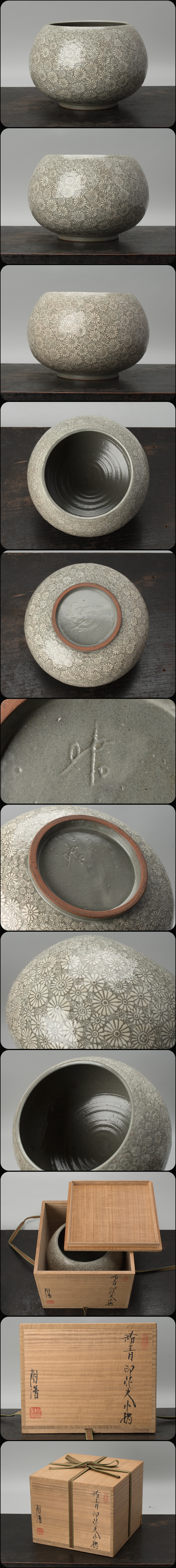 | 申相浩の粉青印花文水指。共箱有。真作保証。 共箱は日本の桐箱ですので、日本国内の個展等で販売された作品です。 水指となっていますが、現状蓋が付属していません。 水指としてご使用の場合は、お客様の方で塗蓋等あわせていただきますよう お願いします。 サイズは、幅約22cm、高さ約15cm。 傷・直しありません。 水指の蓋がありません。 状態・詳細は、画像でご確認お願いいたします。 |