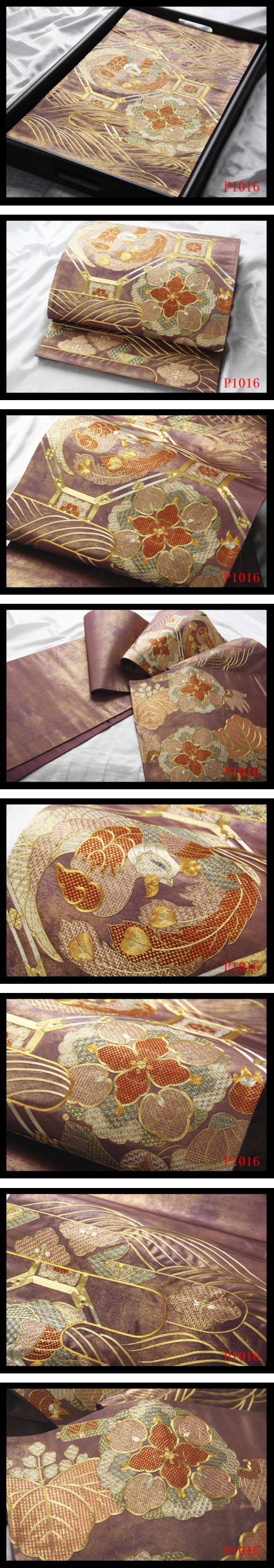 P1016西陣逸品 金駒刺繍 花鳥古典紋 古代紫色地 気品豊かに 正絹純金糸太鼓柄高級美術袋帯 ◇検◇簪着物名古屋帯帯締め 收藏
