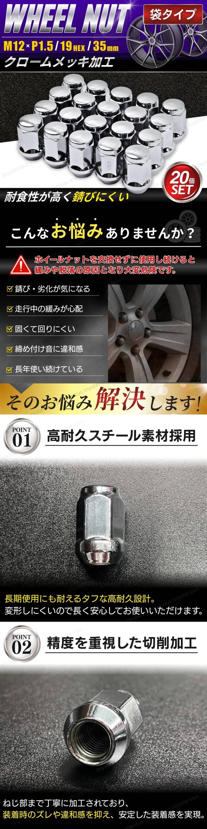 ホイールナット スチールナット M12 P1.5 20個 35mm 19HEX 袋 テーパー ボルト クロム トヨタ マツダ ダイハツ ホンダ ミツビシ いすゞ 收藏