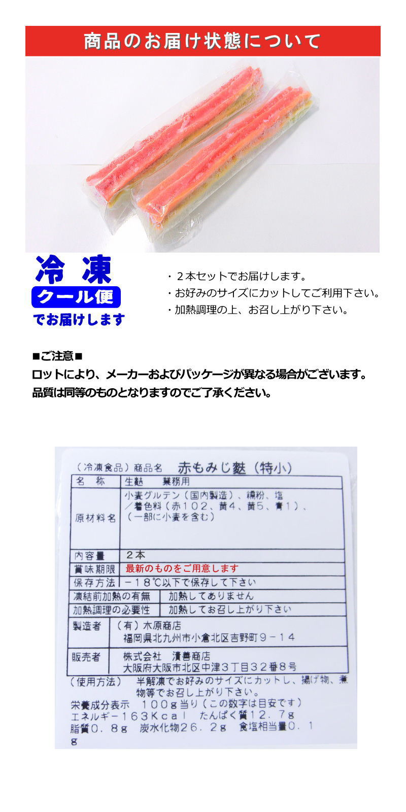 お料理に彩を添える冷凍の生麩の2本セットです。