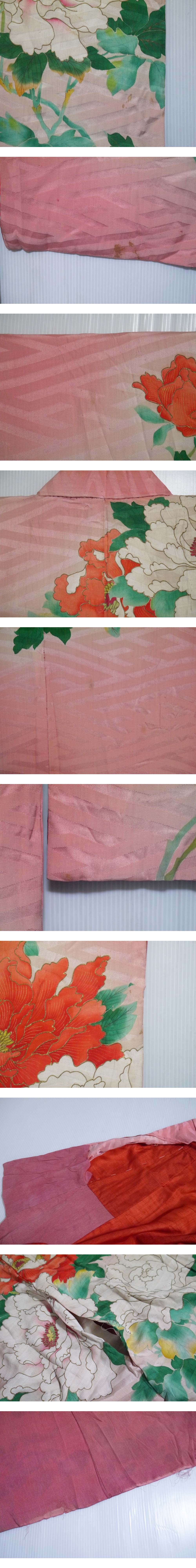【KIRUKIRU】アンティーク 訪問着 着物 正絹 綸子 大正ロマン ピンク 暈し 大輪の牡丹 地紋 レトロ 古布 古裂 リメイク 材料 生地 手芸 收藏