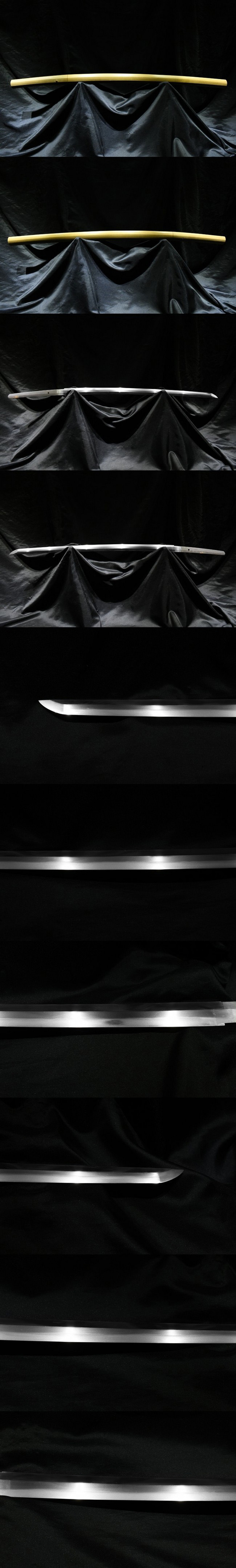 表【肥前国忠吉】 裏【】 種別: 刀 サイズ:長さ 71.6cm 反り: 0.8cm 目くぎ穴 1個 元幅:約 3.307cm 元重:約 0.638cm 先幅:約 2.241cm 先重:約 0.525cm 刀身重量:約 850g(ハバキ・柄をとった状態) ハバキ重量:約 28.6g 鞘全長:約 102.3cm |