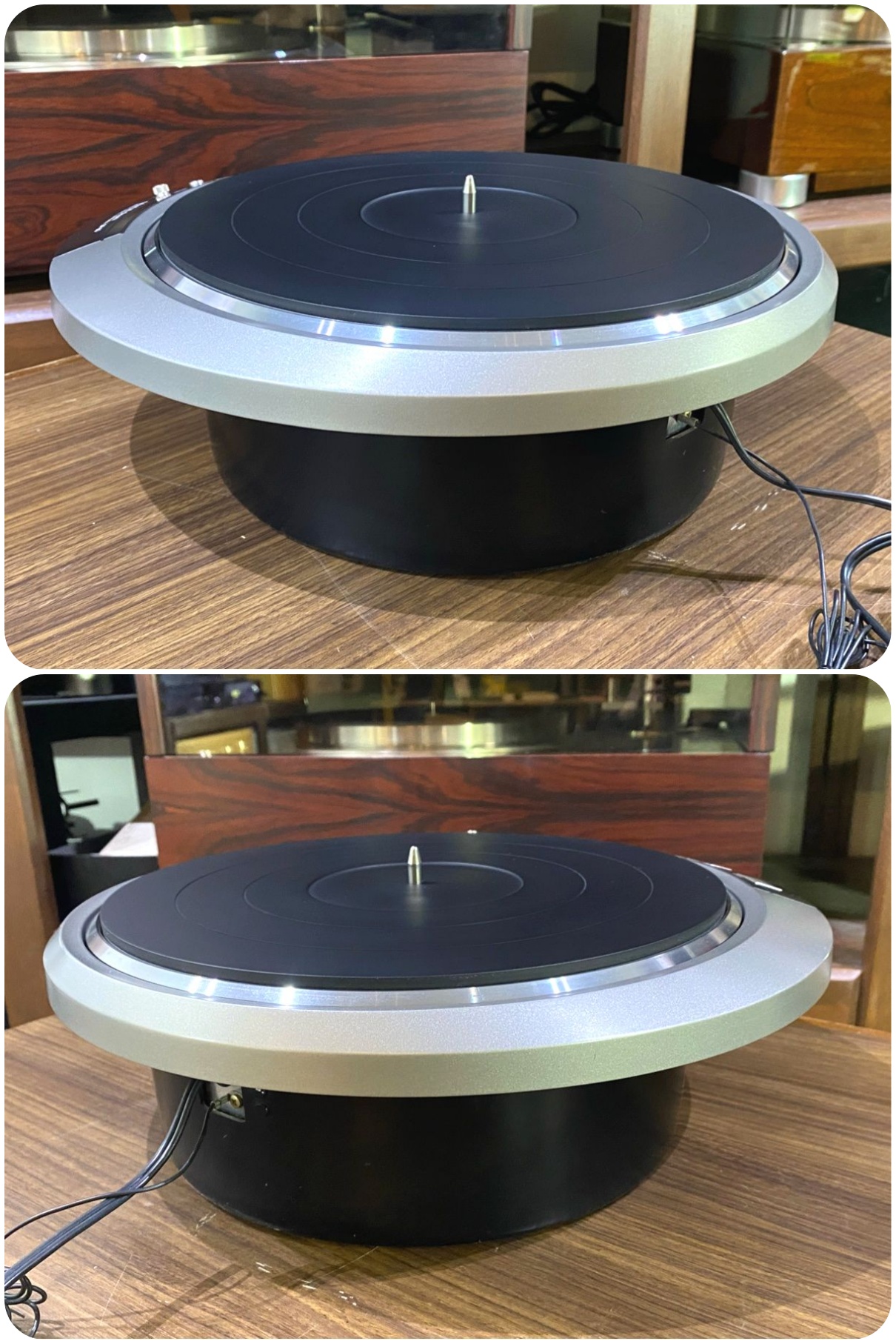 ターンテーブルは、2重構造方式とし、スピーカーの音圧の影響や外部振動による害を極めて