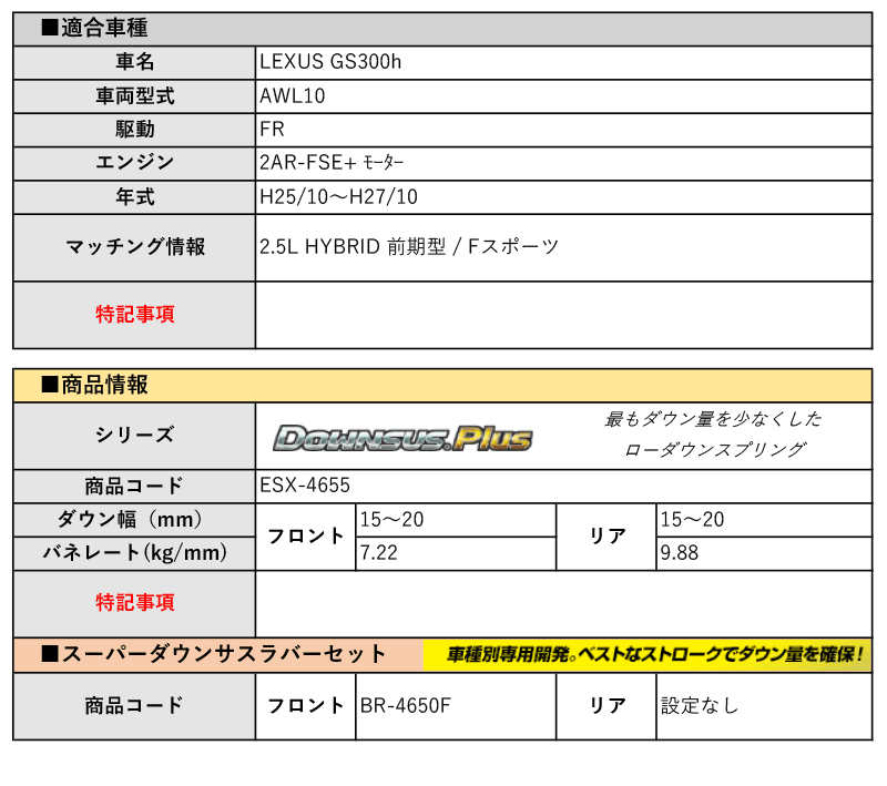 [エスペリア]AWL10 レクサスGS300h_2.5L HYBRID 前期型 / Fスポーツ(H25/10~H27/10)用ダウンサスプラス&バンプラバー[車検対応] 收藏