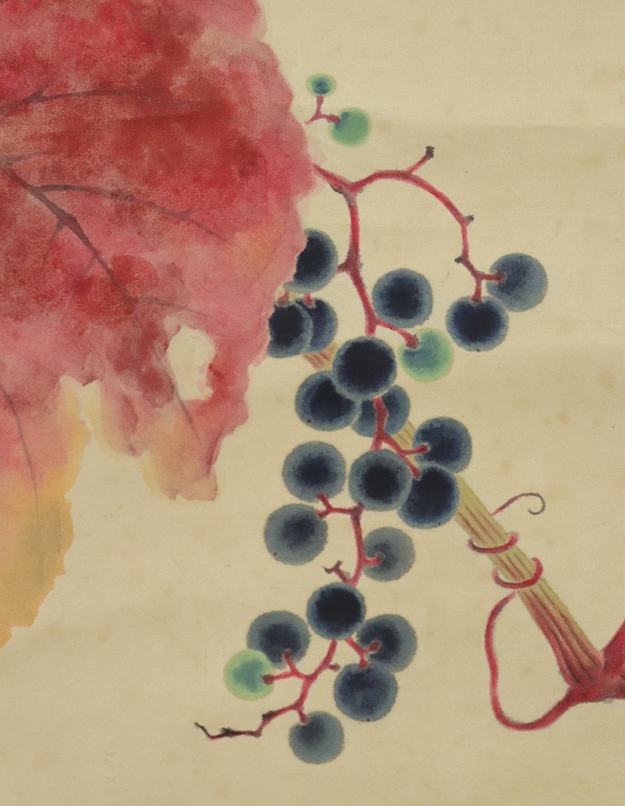 12702■【真作】斎藤茂吉賛 加藤淘綾画 葡萄画賛 肉筆 共箱 日本の歌人 精神科医 伊藤左千夫門下 信州に所縁 掛軸 收藏