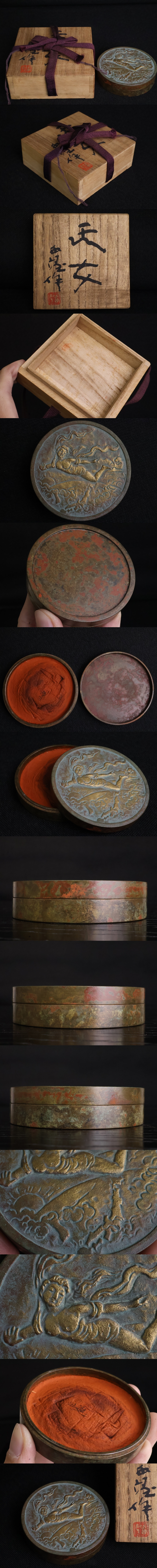 TB526北村西望 天女の飛翔 青銅製 朱肉入れ 共箱◇長崎平和祈念像/彫刻家/朱肉入/朱肉池/印池/書画具/工芸/骨董/古美術/古道具タグボート 收藏