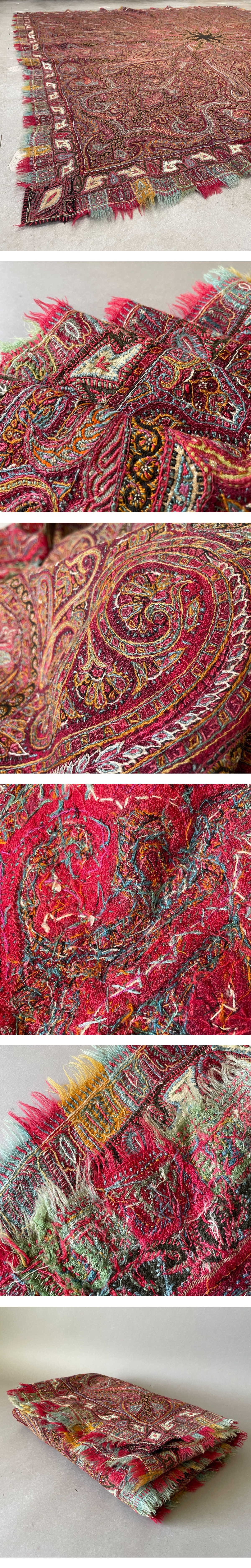 MS4151 コレクター放出品 超貴重 手刺繍 赤地ペイズリー柄 カシミールショール 19世紀頃 サイズ:約175x175cm (検)パシュミナ 手織 古布 收藏