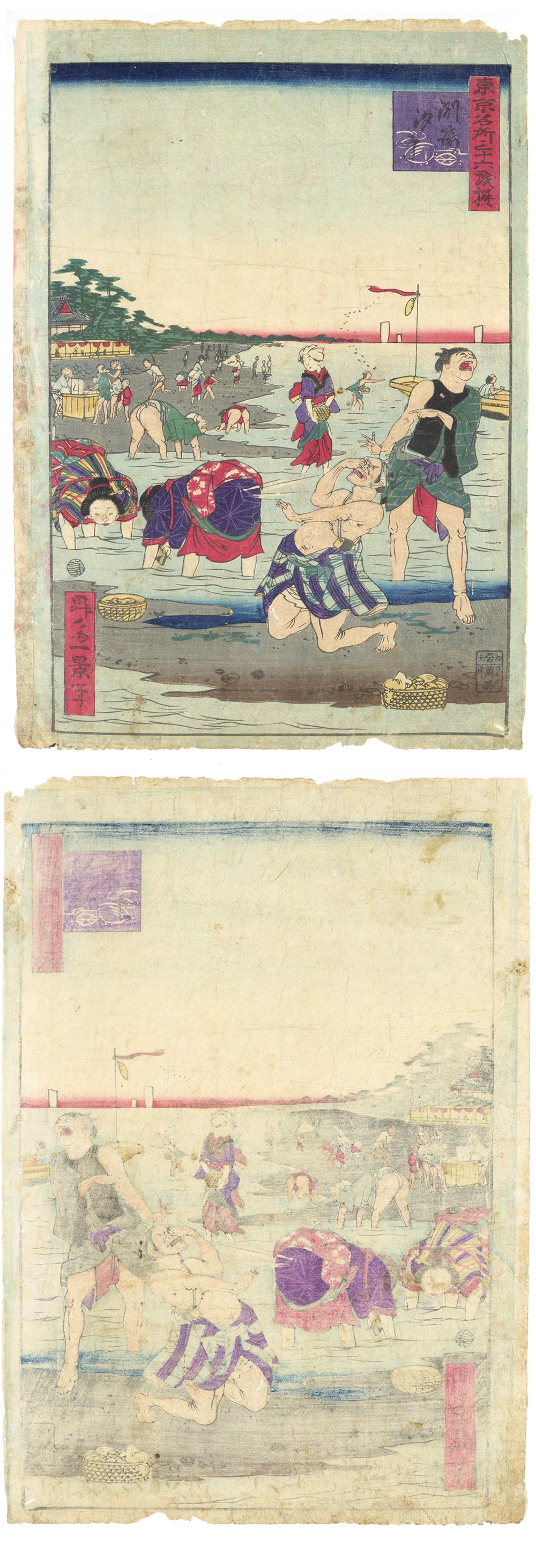 潮干狩り!一景「東京名所三十六戯撰 洲崎汐干」明治5年(1872)本物 浮世絵 木版画 大判 錦絵 ukiyoe 收藏