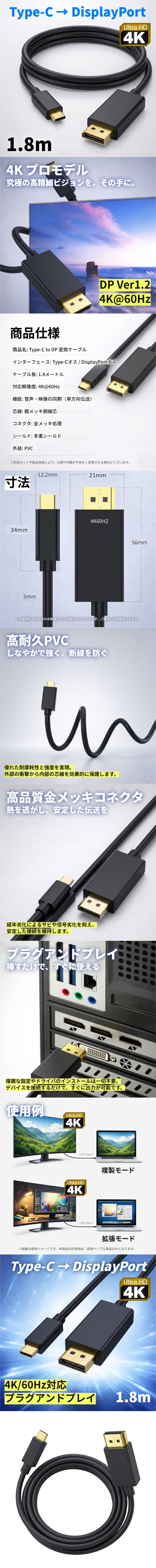 USB Type-C to DisplayPort 変換ケーブル 1.8m 4K/60Hz 変換アダプタ 単方向伝送 接続 USB 收藏