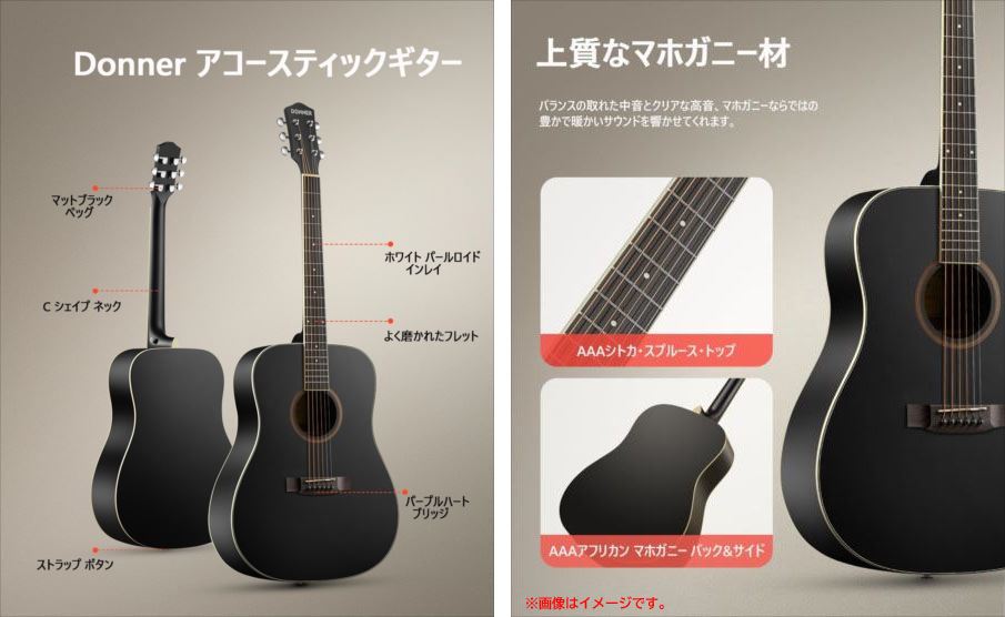 【商品特長】 ◆スプルース材持ち前の美しい音 Donnerフォークギターのトップは上質なスプルース材で作られています。美しい木目だけではなく、 スプルースならではの豊かで温かみのあるサウンドをも響かせてくれます。 暖かくバランスの取れた中音とクリアな高音はどんな音楽ジャンルも向いています。 ◆41インチドレッドノート Donnerアコギはダイナミックレンジの広いクラシックなドレッドノートボディ形状を採用し、 サウンドは非常にバランスが取れていた上、押し出しが強く迫力があるのが特長で、幅広いミュージックスタイルに対応可能です。 ◆細心の注意を払った加工 Donnerアコギは、プロのギター職人によって丁寧に加工され、磨かれています。 ヘッド、指板、ボディはすべて肌にフィットする曲線で、接合部はしっかりと接合されており、 繊細で美しいサンバーストカラーコーティングと相まって、基本的に接合の痕跡はありません。 ◆より便利で安定したチューニング Donnerアコースティックギターは精度の高いギア式ペグを搭載し、より精度高く調整でき、 チューニングもより安定で狂いにくいです。さらに使いやすいチューナーも付属しており、初めてギターを手にした初心者でも簡単にチューニングできます。 | |||||||||||||||||||||||