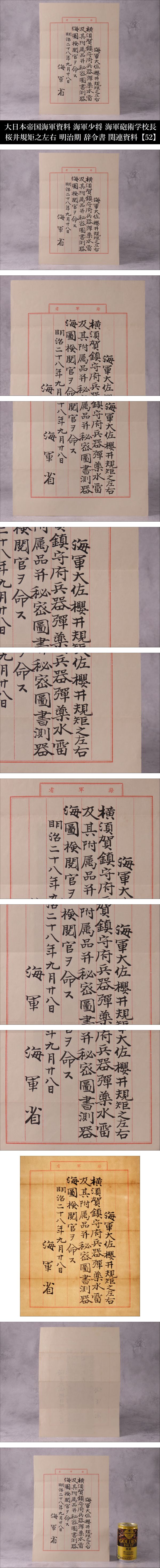 【ONES】大日本帝国海軍資料 海軍少佐 海軍砲術学校長 桜井規矩之左右 明治期 辞令書 関連資料 海軍省 明治二十八年九月二八日 【52】 收藏