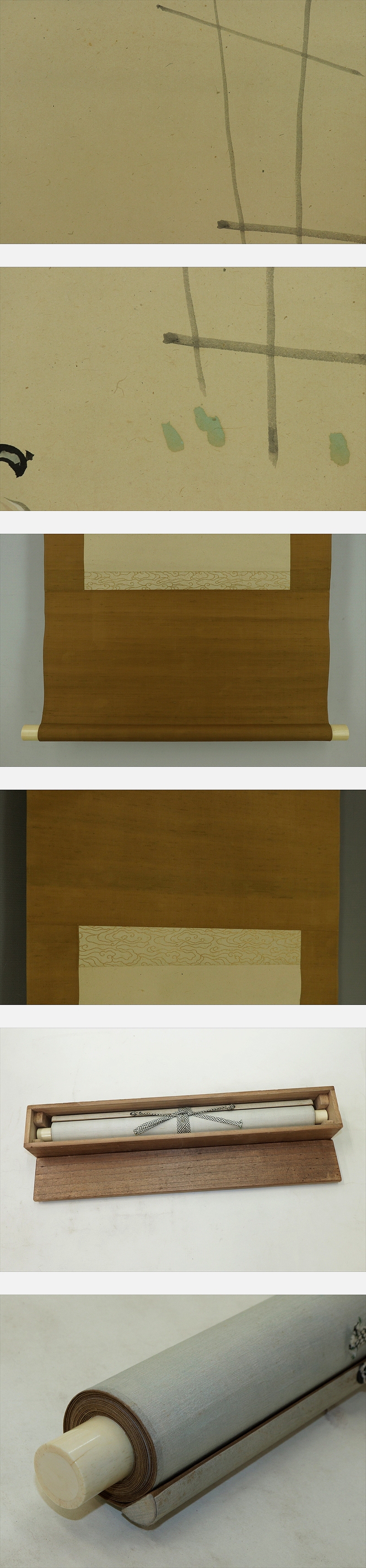 山口華楊 やまぐち-かよう (1899-1984) 大正-昭和時代の日本画家。明治32年10月3日生まれ。 山口玲煕(れいき)の弟。西村五雲にまなぶ。 帝展特選となった「鹿」「猿」で動物画家として定評を得,代表作は昭和29年の「黒豹」。 画塾晨鳥(しんちょう)社を主宰。芸術院会員。56年文化勲章。 昭和59年3月16日死去。84歳。京都出身。 京都市立絵画専門学校(現京都市立芸大)卒。本名は米次郎。 本紙は、軽い染み、折れ、皺があります。 表装は、軽い染み、折れ、皺、ほつれ、軸先に傷みがあります。 【サイズ】 作品 横約30.5cm×縦約126cm 表装 横約43cm×縦約194cm |