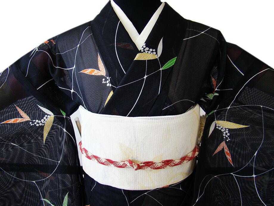 | 商品説明 | こちらのお品は夏物でございますので、7月~8月にお召頂ければと思います。 「絽」と言えば、紗と双璧を成す夏のお着物の生地で、 その最大の魅力は絶妙の透かし加減でございます。 清涼感溢れる地の風を通すしなやかさは夏に着物を着るという贅沢を 快適に愉しませてくれる事でしょう。 着物には、大きく分けて「袷(あわせ)の着物」と「単衣(ひとえ)の着物」と「夏着物」があります。 反物(表地)を着物に仕立てるときに、裏地類をつけるものを袷の着物、 つけないものを単衣の着物と呼び、胴裏や八掛といった裏地がつかない一枚ものの着物です。 また裏地がないため、座る時などにヒップのラインが目立たないよう、 居敷当て(いしきあて)の生地をつけることもあります。 居敷当ては付いておりません。 しなやかな手触りの滑らかなさらっとした肌触りは絹と間違ってしまいそうな 洗える高級ポリエステルの「絽」の生地で涼やかな風合いを醸しております。 黒色地に白、黄、黄緑、橙色等の草木柄の染柄がお洒落な着物姿を演出しております。 帯はしっかりとしたポリエステルの八寸かがりなごや帯(たいこ柄)で扱い易く〆易く、 象牙色地にクリーム色等の花草柄の織柄がお顔映りも華やかな帯姿を奏でております。 帯〆は平組、浅蘇芳色、生成り色の編み込みの組紐となっております。 |