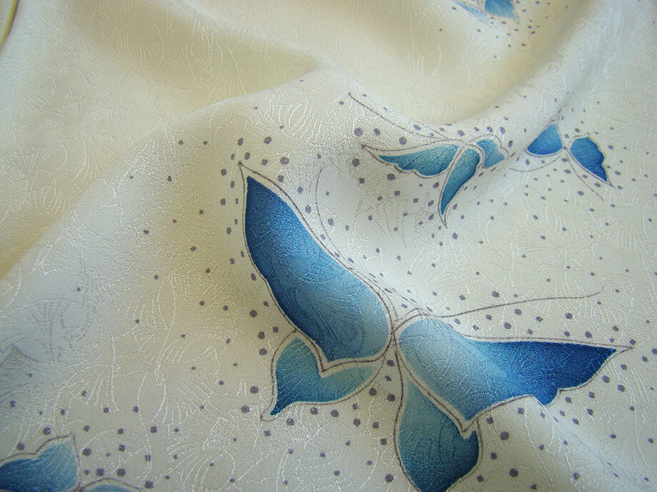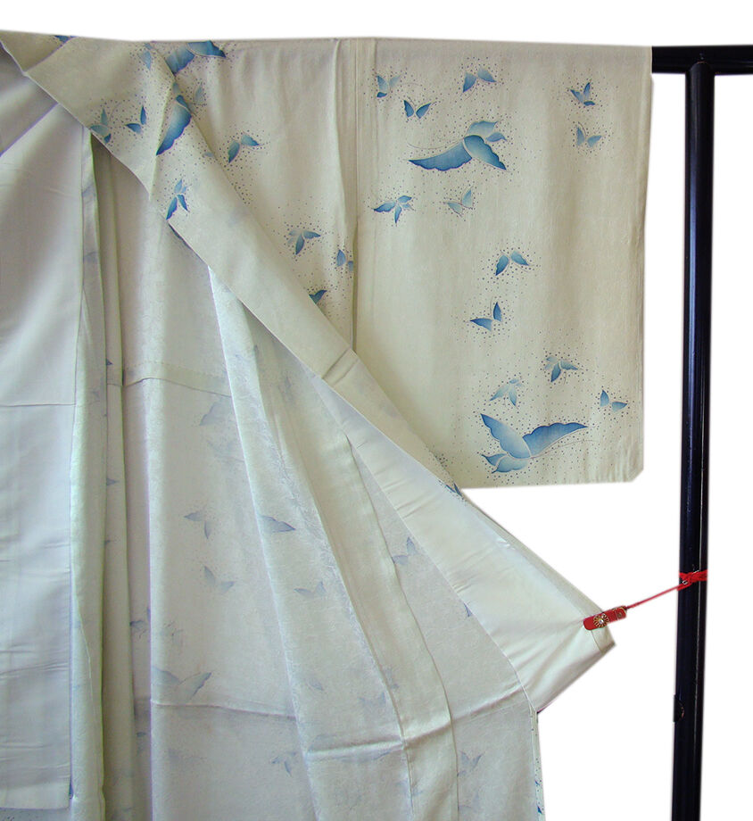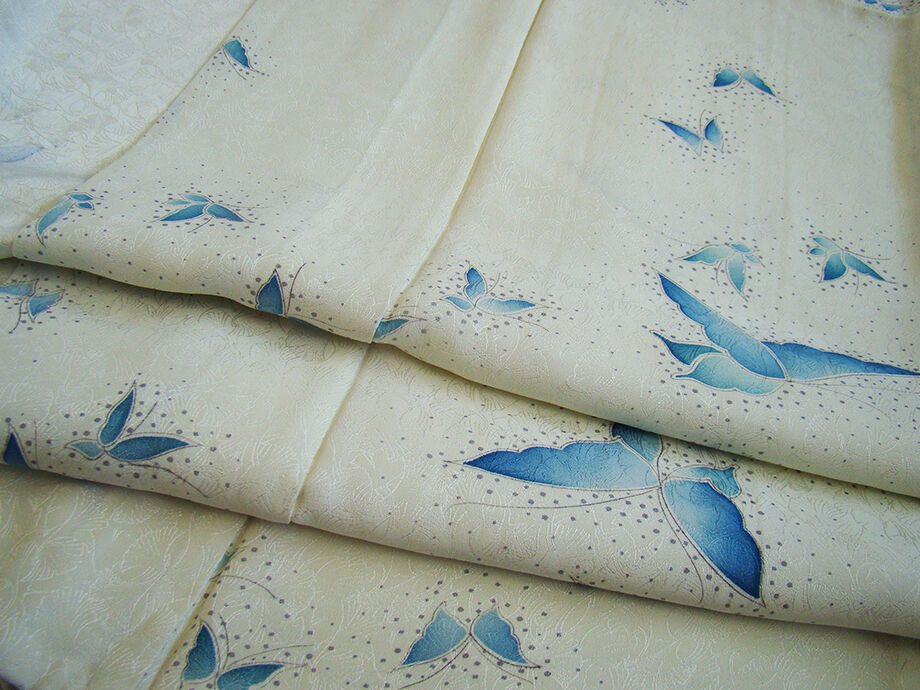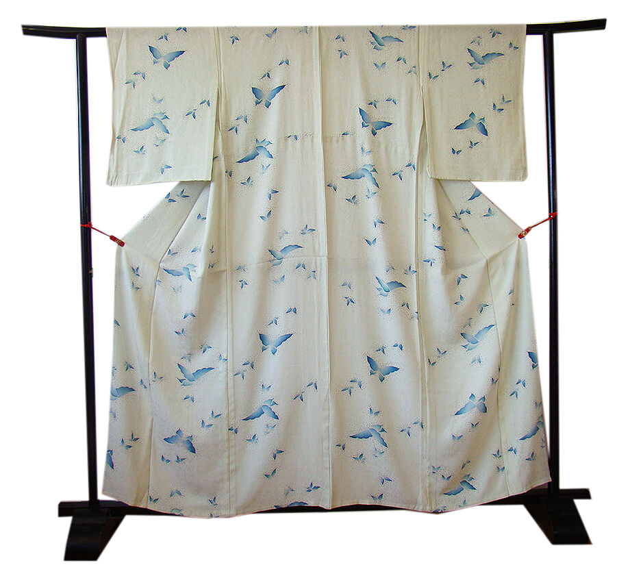 商品説明 | こちらのお品は「単衣」ですので5月、6月、9月にお召頂ければと思います。 着物には、大きく分けて「袷(あわせ)の着物」と「単衣(ひとえ)の着物」と「夏着物」があります。 反物(表地)を着物に仕立てるときに、裏地類をつけるものを袷の着物、 つけないものを単衣の着物と呼び、胴裏や八掛といった裏地がつかない一枚ものの着物です。 また裏地がないため、座る時などにヒップのラインが目立たないよう、 居敷当て(いしきあて)の生地をつけることもあります。 居敷当ては付いておりません。 しなやかなさらりとした滑らかな手触りの着心地良い重めのちりめん地の生地、 象牙色地に地模様入りに藍色の蝶々柄の染柄となっております。 |
