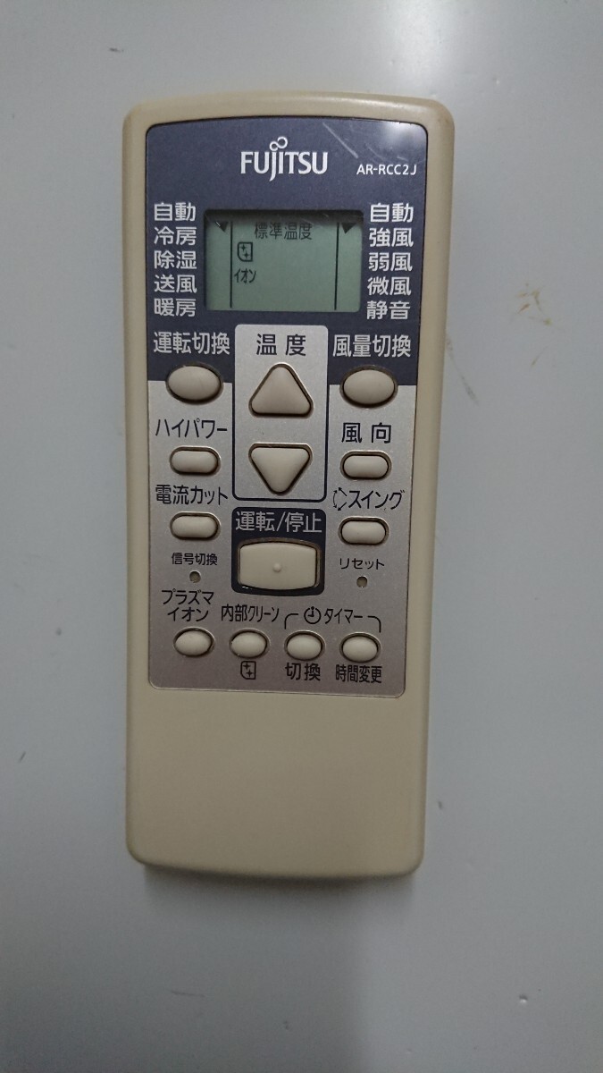 富士通 エアコンリモコン AR-RCC2J中古動作品です。中古ですのでキズ汚れあります。液晶表示ボタン操作確認しました。発送は定形内180円サイズです。中古ですのでノークレームノーリターンです。