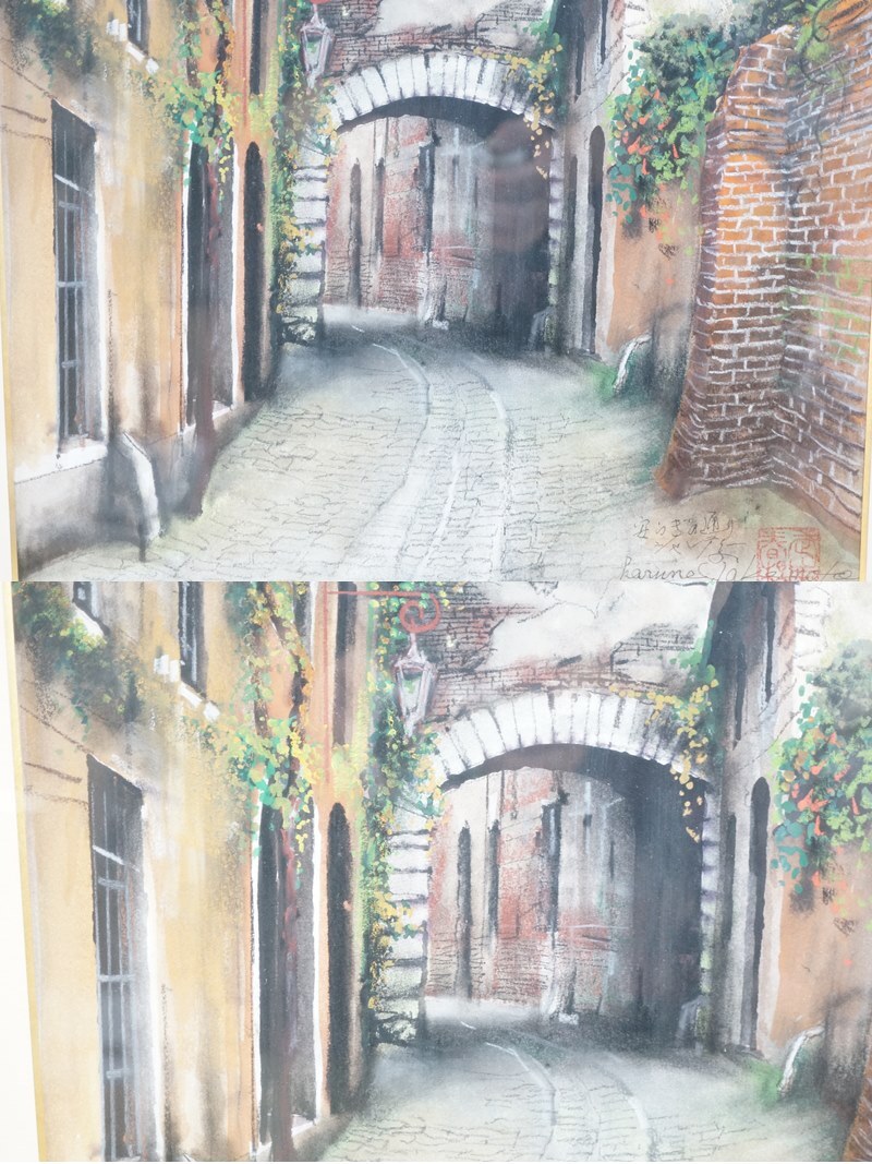 東ハ:【絵画】真作 武本はる根「 アーチの在る通り 」額寸約縦67.5×横55.3㎝ 武本春根 武本はるね 風景画 額装品 インテリア ★送料無料★ 收藏