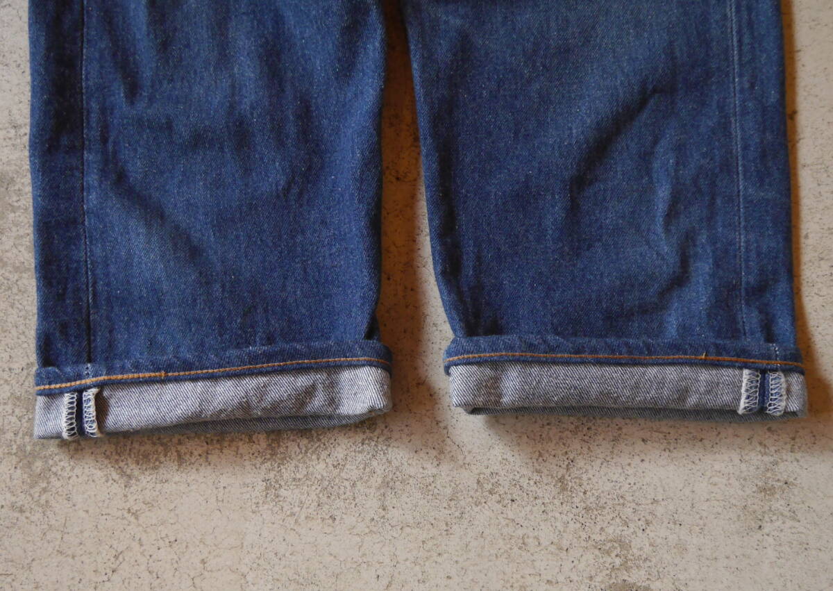 まだ生地に色が60%ぐらい残っている濃紺美中古品です。裾はユニオンスペシャルのチェーンステッチです。