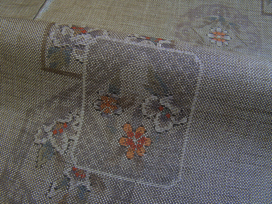 墨色地に白、柿色、グレー、緑色等の色紙に花柄の織柄。