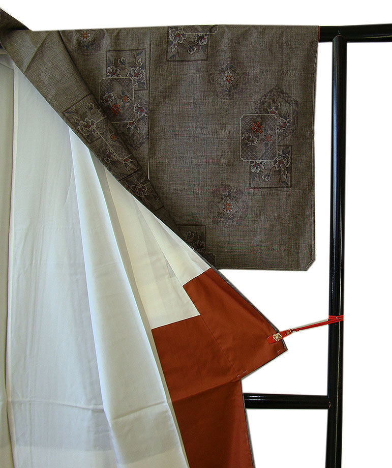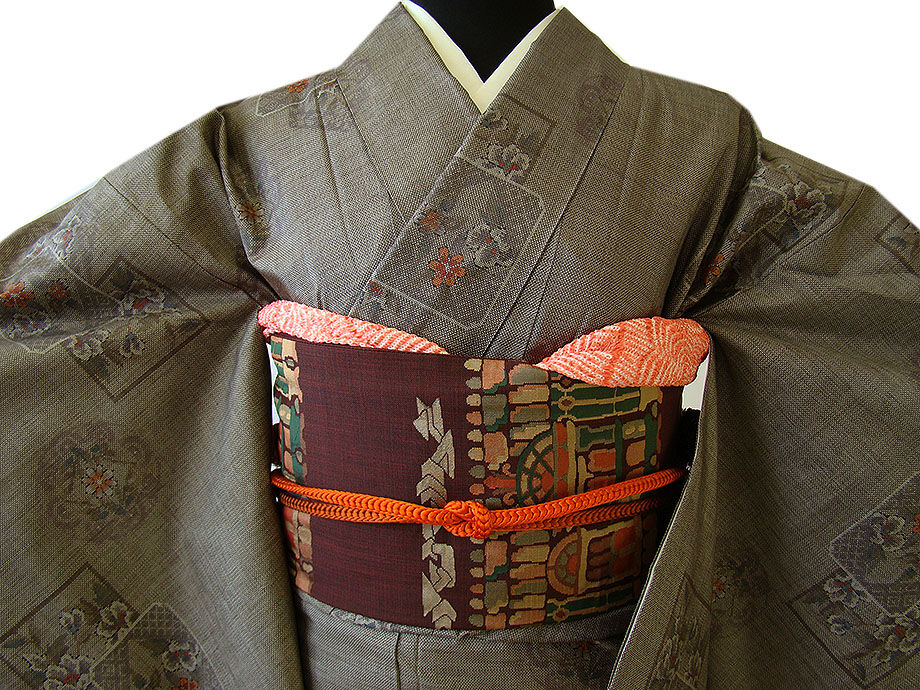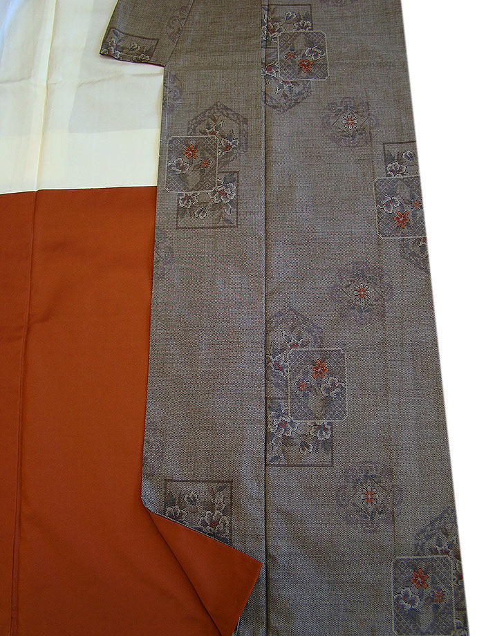 八掛はレンガ色(正絹)    手縫い仕立。   身幅が少し細めです。