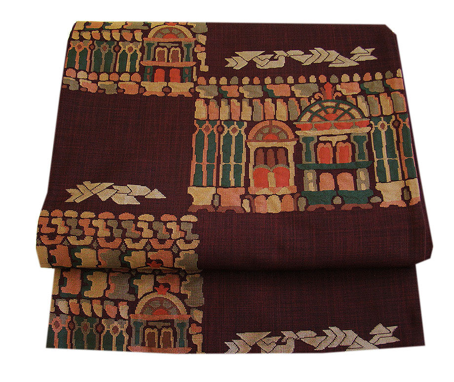 渋い海老色地にベージュ、緑、レンガ色等の壁画の織柄。
