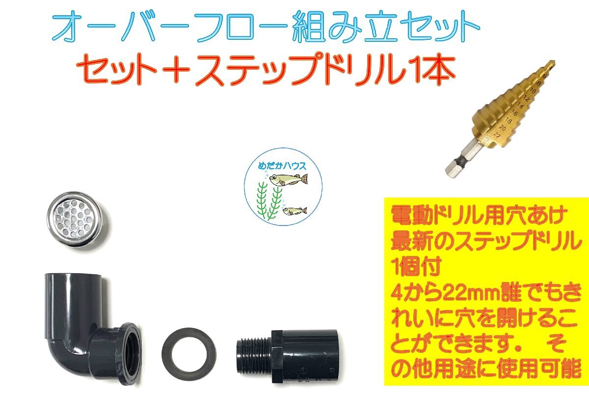 ?オリジナルメッキキャップ付(呼び径16)とステップドリルセットセット内容 ★L型パイプ・直線パイプ・ゴムパッキン・メッキキャップ x 各22個(呼び径16) ?ステップドリル4~22mm x 1個(シャンク径10mm・一般的な電動ドリルに適合) ? 雨や足し水の際、タライ容器などの水位を一定に保つ為の穴開け加工(オーバーフロー加工)用部品とステップドリル(穴あけ工具)のセット、未使用新品・送料無料。 NVボックス、トロファスト、ジャンボタライ、トロ舟、プラ舟等の合成樹脂(プラスチック)アルミ、鉄製メダカ飼育容器の水溢れ対策に使用します。メダカの吸い込まれ防止にはオリジナルのメッキキャップを使用しています。 メッキキャップですので、ネット(網)に比べて堅牢かつ見た目もスッキリしますし、汚れや詰まりも清掃できます。 また、手で簡単に取り外せますので裏側も簡単に清掃できます。簡単に分解・再取り付けができますので容器の収納時にも便利です。 ホームセホームンター等で販売されているステップドリルは高価ですが、ステップドリルだけでも価格が安いので価値があります。いろんな使用用途が増えます。このセットでしたら気軽に加工に取り組めると思います。 、【インパクトドライバー使用不可。ドリルドライバーホーム大型ホームセンターでレンタルできる事が多いです】【施工手順】 1.穴あけ位置を決める2.ステップドリルで穴を開る。 3.容器の内側にパッキンを挟みL型と直線のパイプを通して手で絞めつけます(軽く締める程度でOK)。 ※穴あけ位置が高めになった場合はパイプを斜めにして水面を下げ調整する事ができますが、上げ調整はできませんので高め推奨です。・写真の容器類は商品に含まれてないです。またロットによって色合いや質感が若干異なる場合がありますメダカハウス