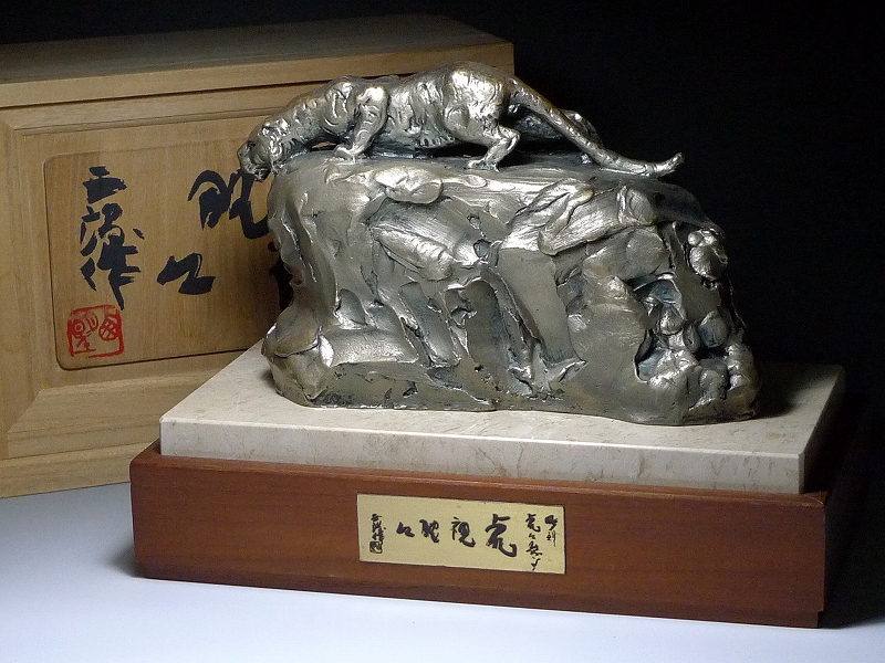 10HT107★北村西望造 銅像 「虎視眈々」 こしたんたん 虎 美術品 芸術品 置物 台座付き ブロンズ 共箱 インテリア 虎 干支 骨董 收藏