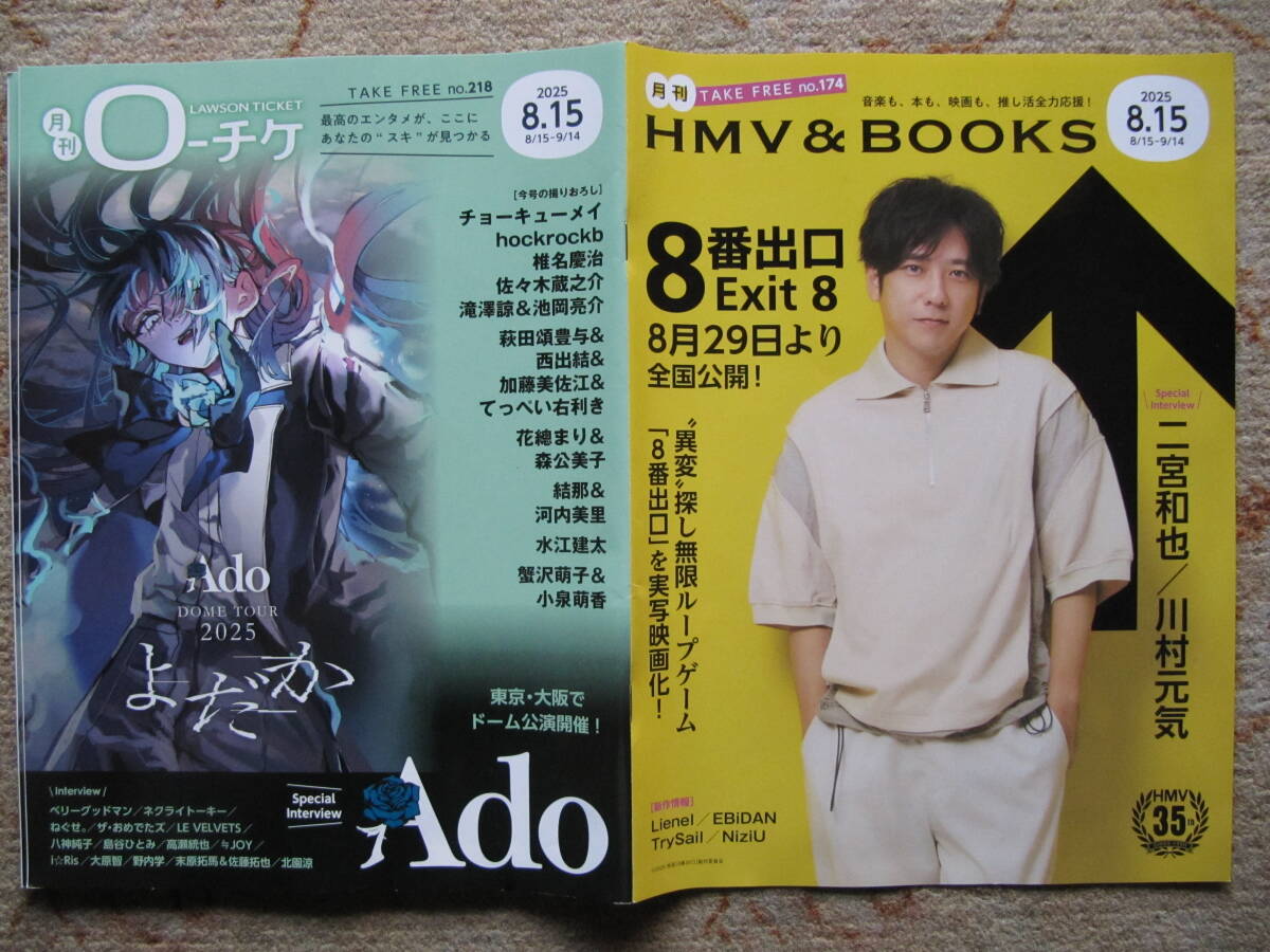 フリーマガジン 月刊HMV&BOOKS ローチケ 2025.8.15 2冊 二宮和也 Ado ベリーグッドマン ネクライトーキー チョーキューメイ ねぐせ 收藏