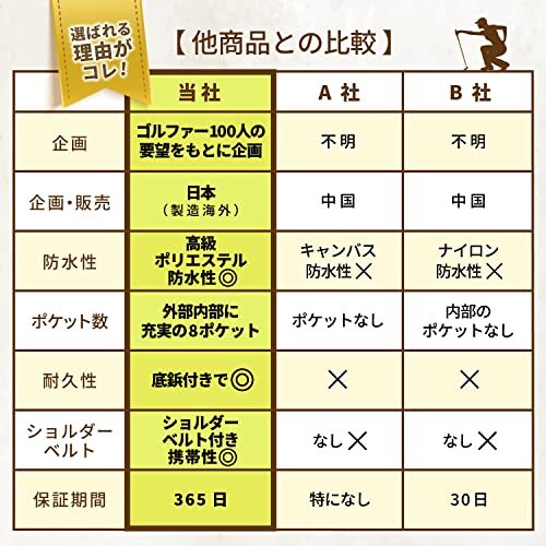 【強防水性、ショルダーベルト、底鋲付属】生地には防水性と耐久性を兼ね備えたポリエステル生地を使用。ショルダーベルト付きなのでゴルフクラブやバッグで両手がふさがっていても大丈夫です。バッグの底面には汚れや摩耗を防ぐ底鋲付きで濡れた芝生の上に置いても中身を守り、お手入れも簡単です。