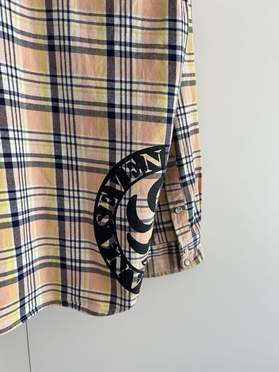 Banana Seven western flannel shirt with embroidery details. Iconic multi-color plaid with bold back logo. A true 00s streetwear piece with vintage appeal.