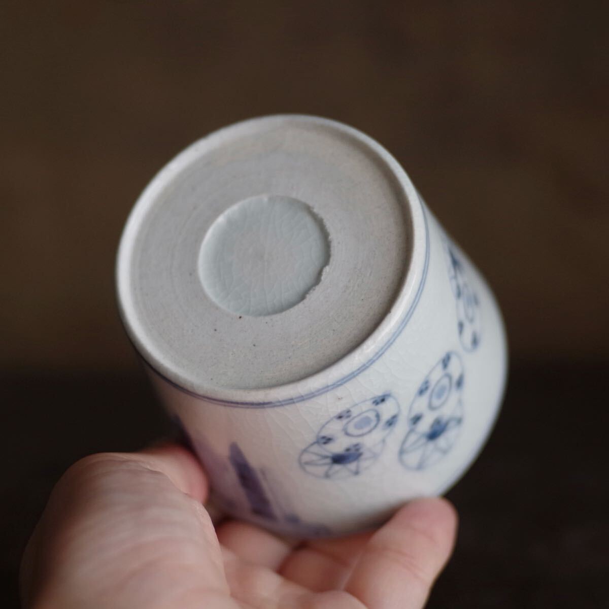 鼓が描かれた、江戸後期の古伊万里蕎麦猪口でございます。資料などでもほとんど見かけたことがありませんので、希少な手と言えるかと思います。転がるように描かれた軽やかな印象の鼓には、春らしさが感じられます。絵の可愛らしさに加え、整った成形や素地の白さなどからも、当時の職人の技術の高さがうかがえる上手の蕎麦猪口かと思います。