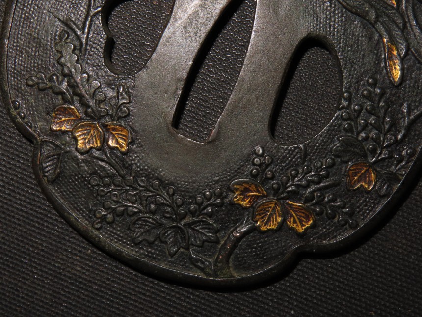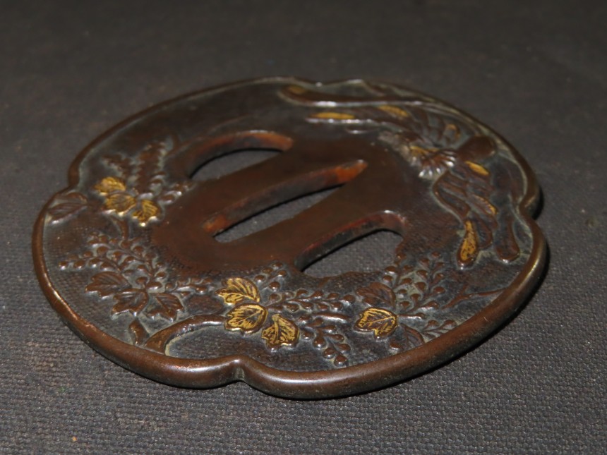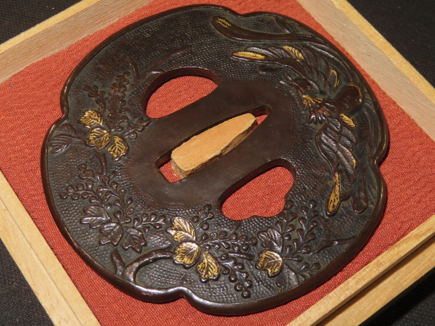 大刀孔雀図鍔 江戸 銅、魚子地、毛彫、金色絵、銅覆輪 箱付 7.5×7.5×0.3cm 100/160g 收藏