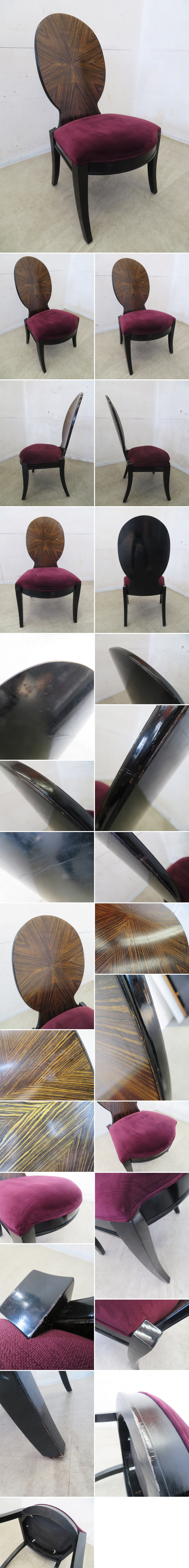 米国Century Furniture社製のオムニ サイドチェアです。 Century Furnitureは、高級住宅用家具の世界的なメーカーの一つであり、 職人の手作業による高品質な家具を製造しています。この椅子も、その高い品質基準で作られています。 洗練されたデザインと卓越した職人技が光る逸品で、ダイニング空間を格調高く彩ります。 特徴的なのは、背もたれに施された美しい木材の象嵌細工。 クールで力強く、かつ温かみのある幾何学的なデザインが、 見る人の心を引きつけます。座面は上品なバーガンディ色の布張りで、 エレガントな外観と快適な座り心地を両立しています。 創業1947年の老舗高級家具メーカー「Century Furniture」は、 デザイン性と品質において業界のリーダーと評されており、その製品は長く愛用できることで知られています。 目立った傷や汚れのない良好な状態です。モダンからクラシックまで、 様々なインテリアに調和するデザインですので、お部屋のアクセントとしていかがでしょうか。 この機会に是非ご購入ご検討ください。 コンディション:中古品の為、写真の様に傷や汚れが多く、塗装にれ箇所が多数あります。 サイズ横58センチ奥行き66センチ高さ104センチ座48センチです。