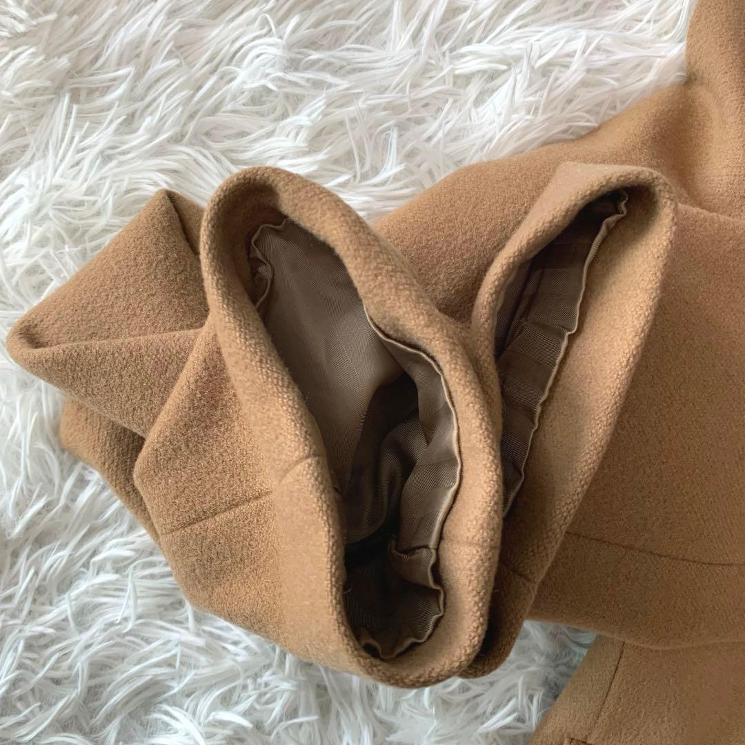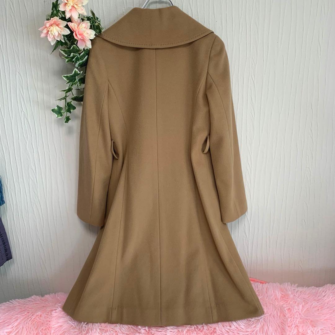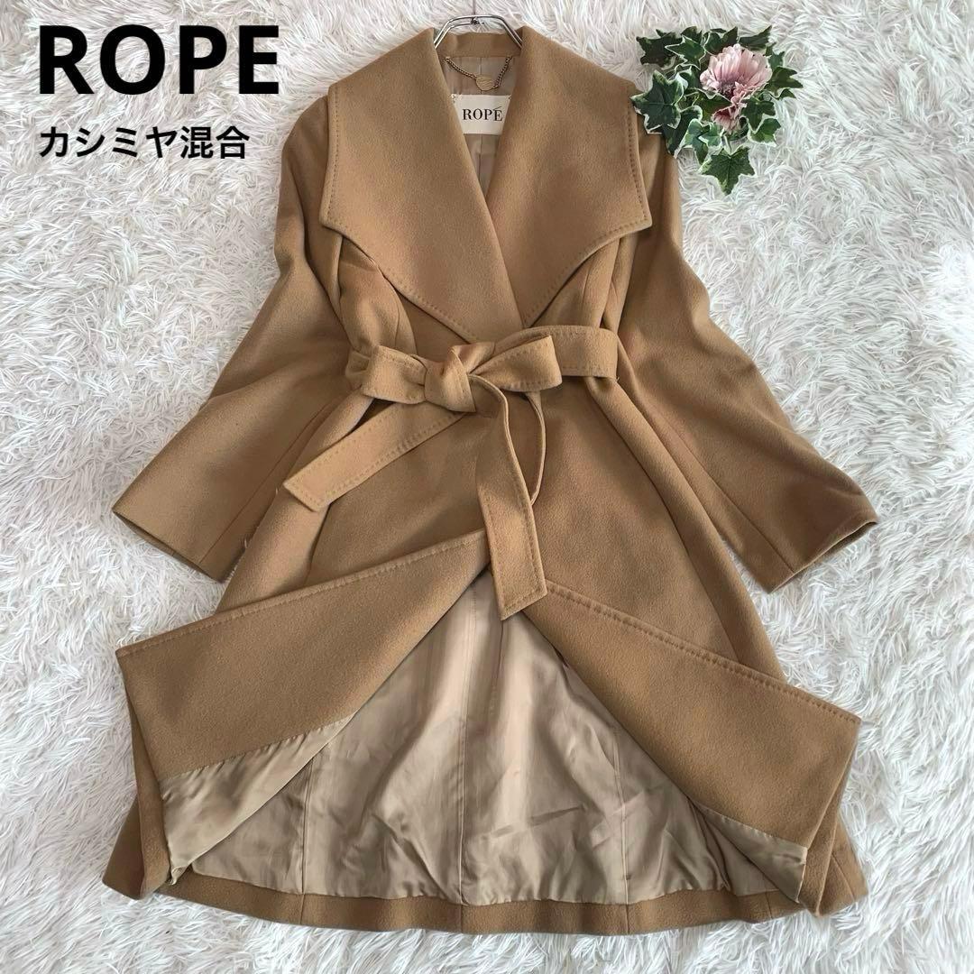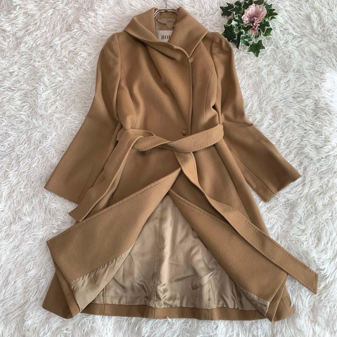 美品◆ROPE【カシミヤ混/女優襟◆ガウン:ベルテッド:ラップ:ロングコート】S ビックカラー ベルト リボン フレア Aライン キャメル色 ロペ 收藏