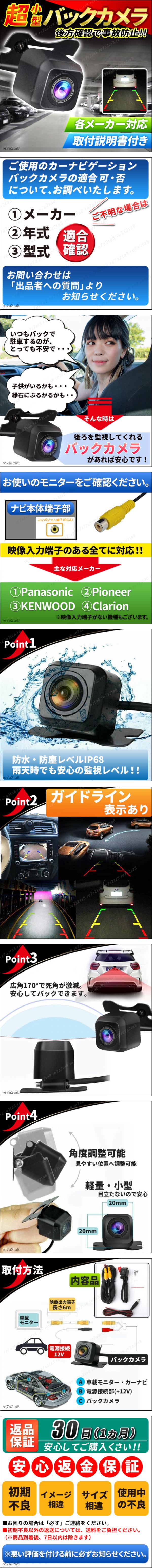 | 商品説明 | 【商品名】 車載用 防水 小型バックカメラ(リアカメラ) 【対応メーカー】 ご不明な場合はお調べいたしますので 「型式」および「年式」をお知らせください。 ①Panasonic ストラーダ ②Pioneer カロッツェリア ③KENWOOD 彩速ナビ ④clarion クラリオン ※ナビ側のRCA映像入力端子に接続してご使用ください。 【用途/使用】 車載モニターやカーナビゲーションのモニターに接続 バック駐車時の後方確認の安全運転をサポート 【小型軽量設計】 新高感度約42万画素CMOSセンサーを搭載し、超高画質カラー映像 超小型ボディ(約20mm×20mm)で取付け後も目立たず邪魔になりません。 【魚眼レンズ搭載】 ワイドリアビュー広角170°の後方監視で死角をなくしました。 取り付け後の角度調整も可能 【ガイドライン表示】 駐車の際に有効な対象物との距離の目安確認ができます。 【防水性能】 国際防水防塵規格 IP68 さまざまなシビア環境にも対応。 ________ 【セット内容】 ①小型バックカメラ ②映像用ケーブル:約6m ③電源ケーブル ④固定用ネジ:2本 【詳細情報】 ■電源:DC12V ■信号方式:NTSC / PAL ■有効画素数:960×576ピクセル ■レンズ視野角:170度 ■防水レベル:IP68 ■ビデオ出力:1.0Vp-p、75Ω ■消費電流:130-150ミリアンペア ■動作温度:-30~+ 85° ________ 【配送方法】 ■全国送料無料 おてがる配送ゆうパケットポスト ________ |