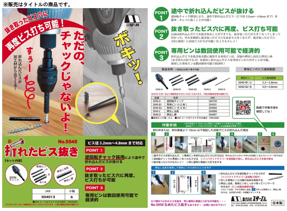 スターエム STAR-M折れたビスを抜くことを諦めない折れたビス抜き品番:5040■用途途中で折れ込んだビスを抜く■特長・ビスを抜き取った穴は損傷が少ないので、再度同じ箇所にビス打ちが可能です・専用ピンは数回使用が可能です■仕様・適用材:一般木材・材質:逆回転チャック:普通鋼専用ピン:普通鋼押出し治具:普通鋼押出し棒:ハイス鋼・適用機種:インパクトドライバ14.4V以上・適正回転数:3,000回転/分以下※注意事項・専用ピンはビス適用範囲内でご使用ください・作業を行う場合は、保護メガネ・手袋を着用してください・堅木など、材によっては専用ピンが叩き込めず折れ込んだビスがうまく抜けない場合があります・押出し治具を使用して専用ピンを外す場合は、土台が平らで硬い場所で押出し治具、専用ピンをしっかりと持って作業を行ってください・折れ込んだビスに専用ピンを打込みすぎると、ビスが外れない場合があります■セット内容・逆回転チャック・専用ピン小/大・押出し治具・押出し棒