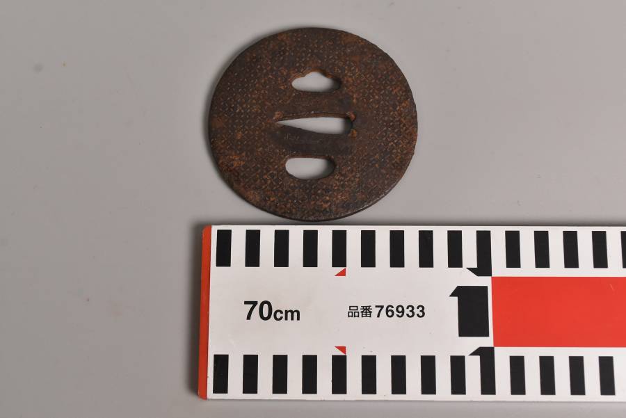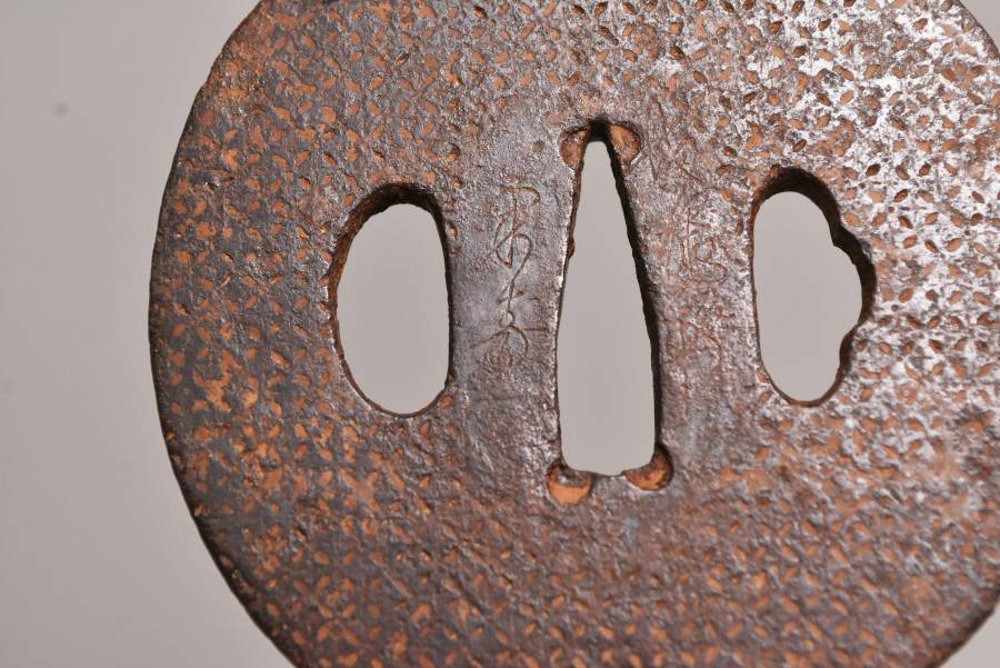 鉄地 七宝模様鍔 成龍軒栄寿銘 金印 丸型鉄磨地 鋤下彫 角耳小肉 / 武士 武具 足軽 大名 侍 日本 戦国 刀剣 兜 甲冑 鎧 面頬 具足 Ab-143S 收藏